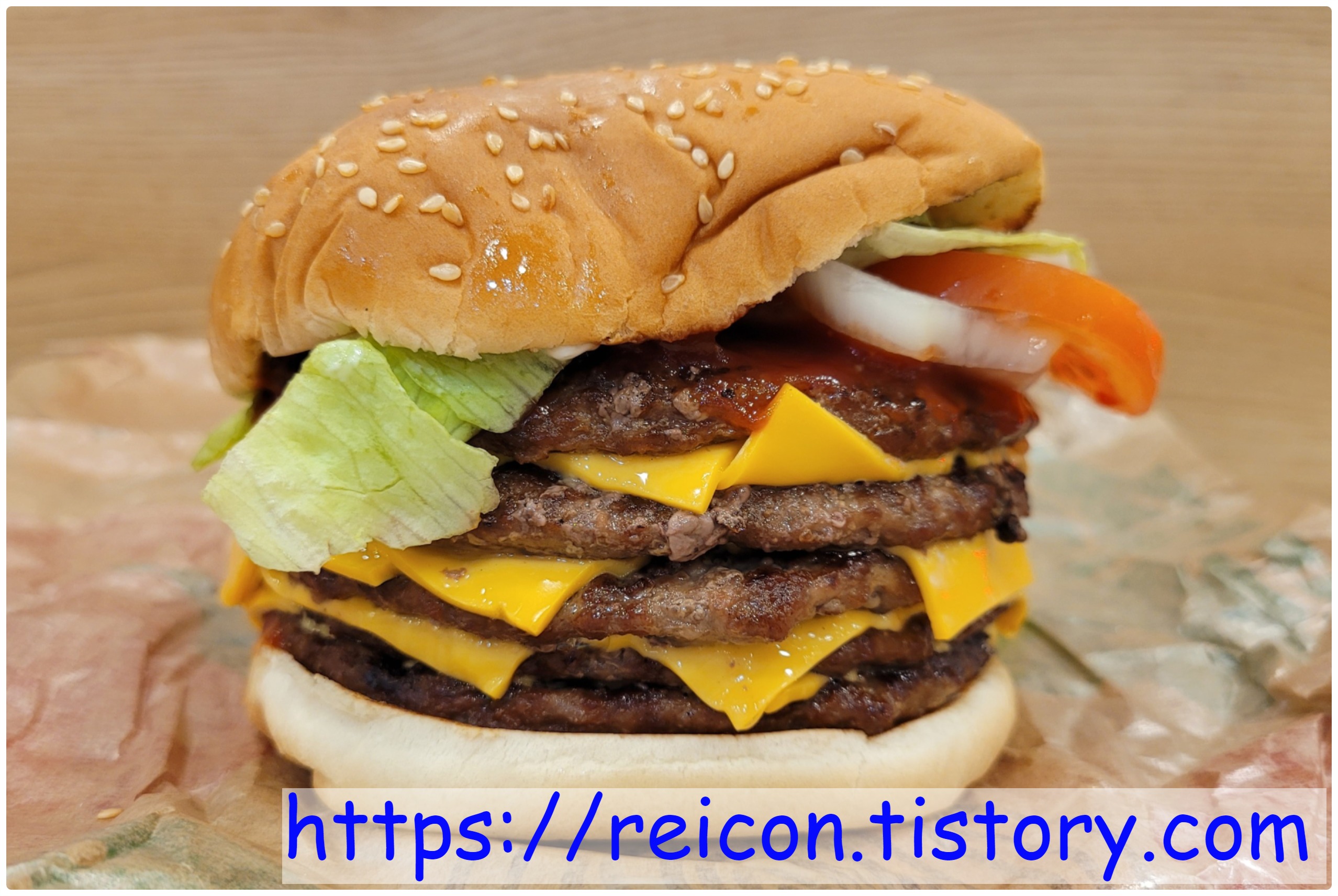 재료는 '참깨빵, 마요네즈, 양상추, 토마토, 양파, 케첩, 비프 패티, 슬라이스 치즈 2장, 비프 패티, 슬라이스 치즈 2장, 비프 패티, 슬라이스 치즈 2장, 비프 패티, 슬라이스 치즈 2장, 비프 패티, 케첩'입니다.