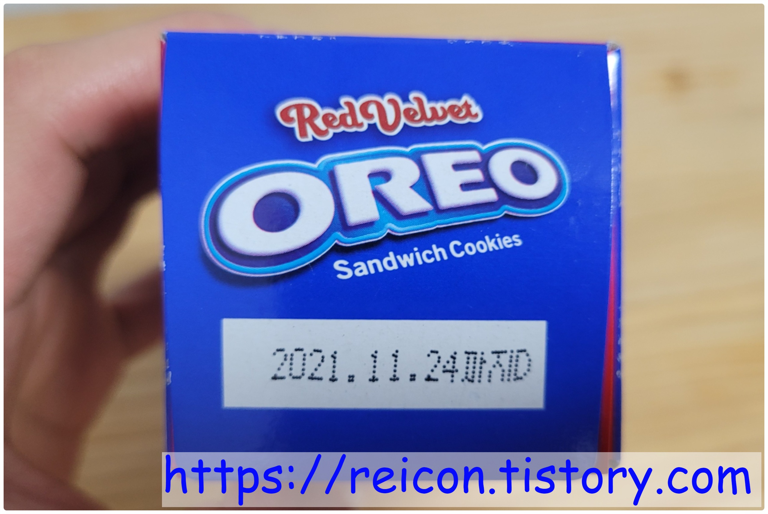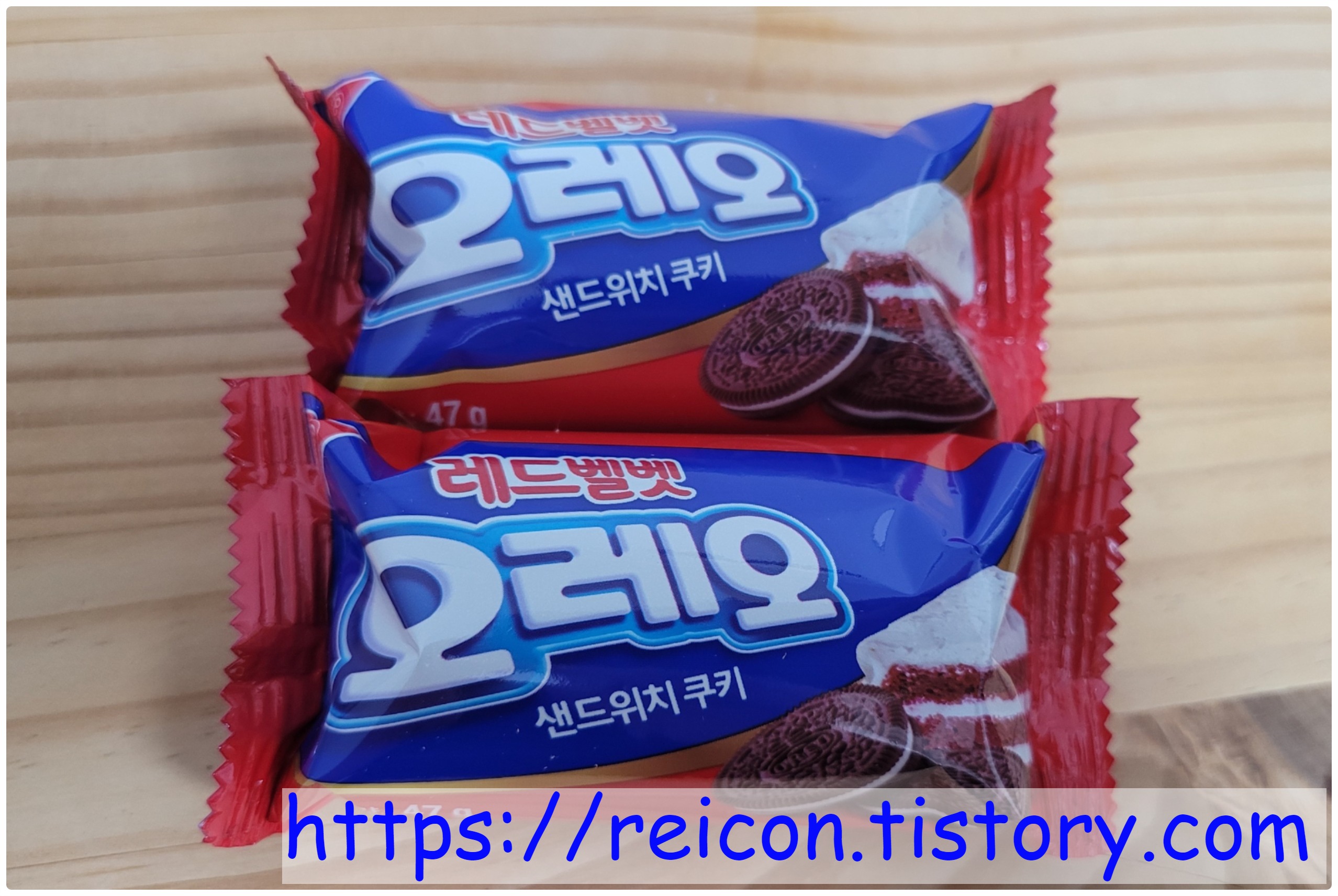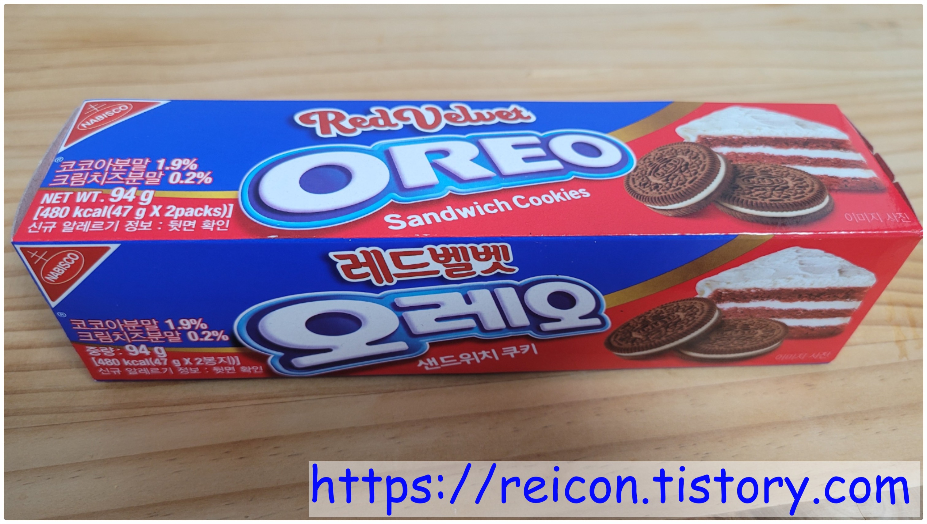 세계적으로 유명한 샌드위치 쿠키 '오레오'의 레드벨벳 맛이며, 한정판으로 나왔는데 반응이 좋아서 그런지 지금까지도 계속 판매를 하고 있는 제품이죠.