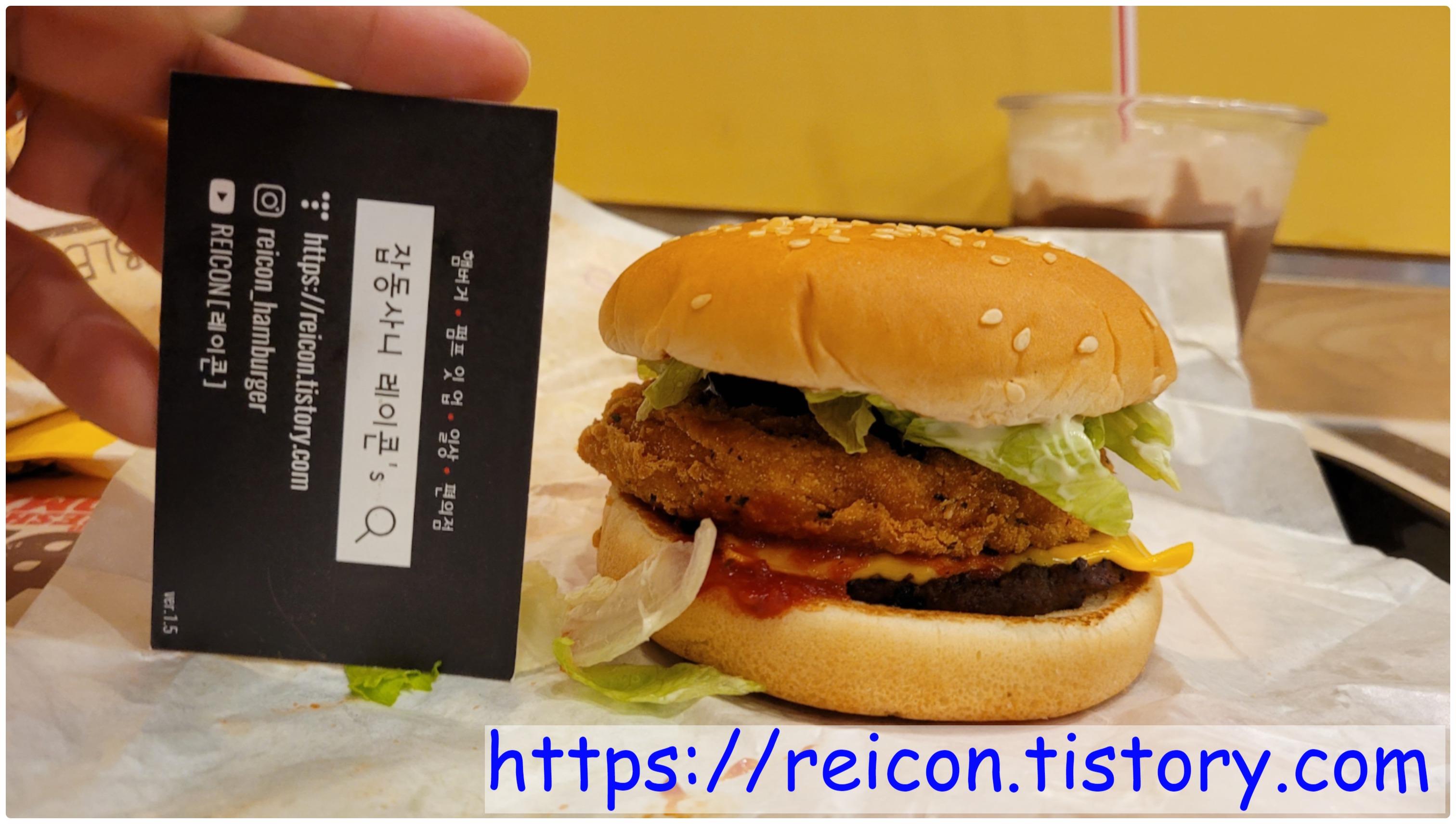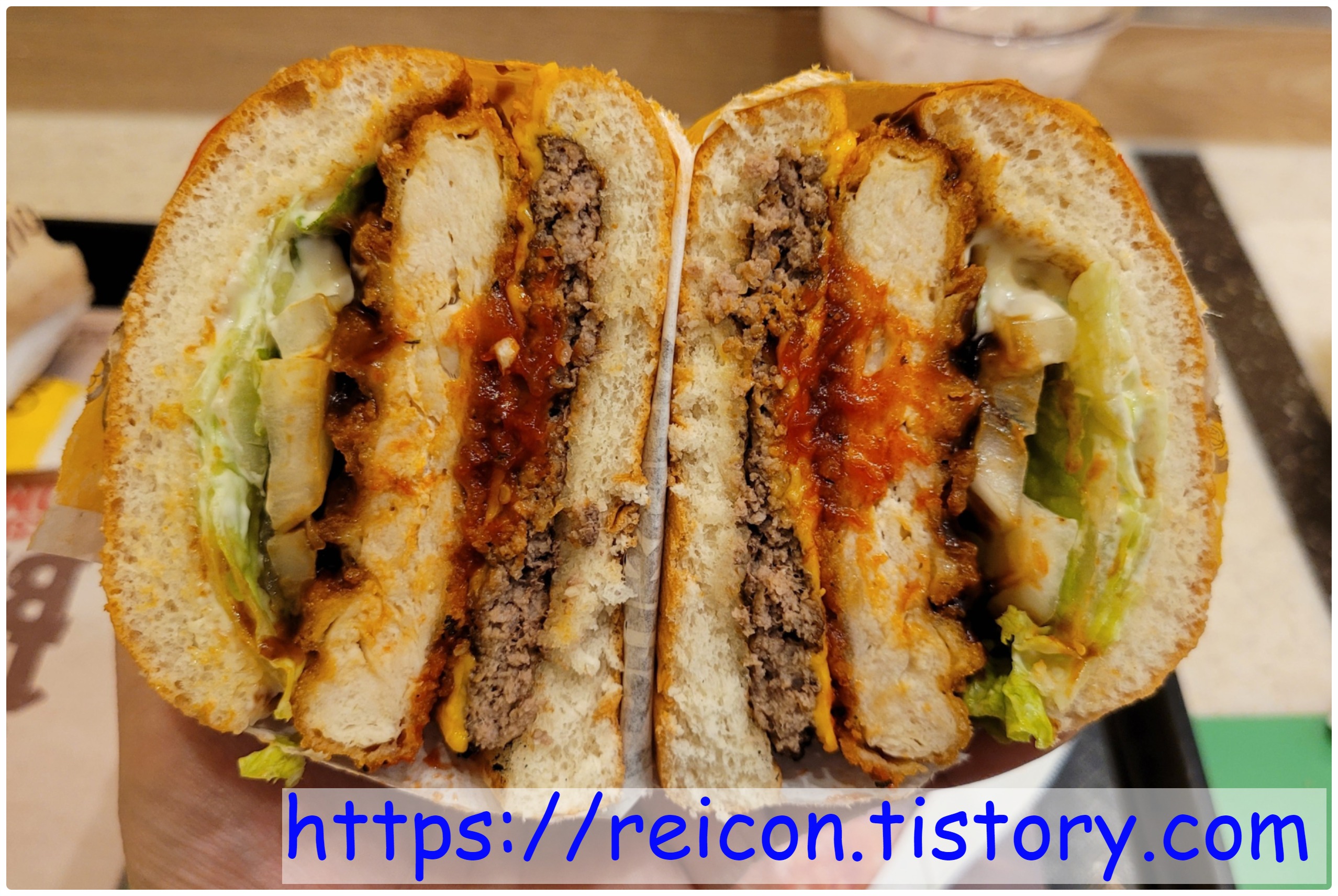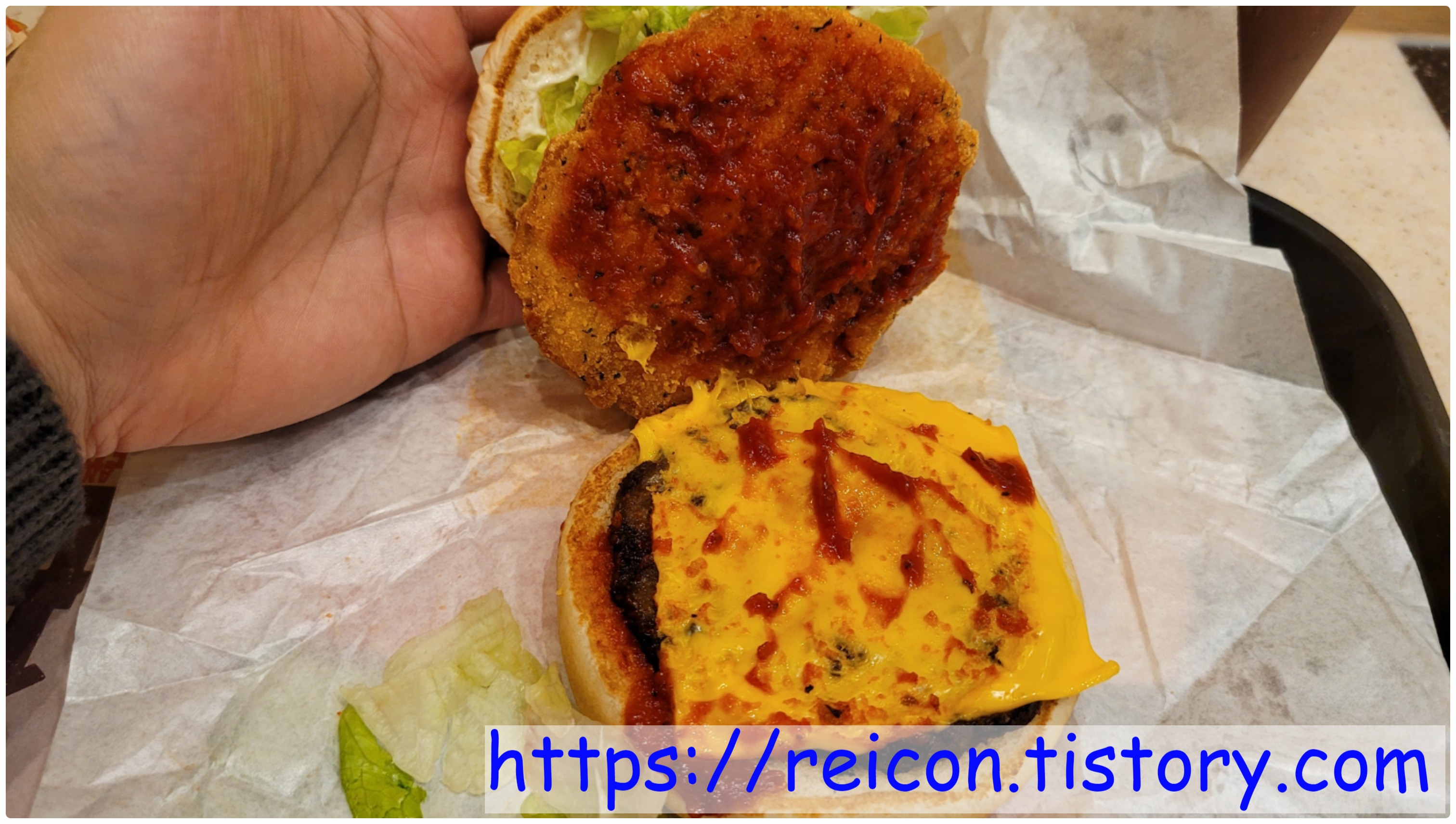 단순 조화를 이루는 것이 아니라 치킨 패티의 담백함에 비프 패티의 불맛과 깊은 풍미가 더해져 더욱 깊은 맛이 났는데, 중간에 있는 치즈가 유화제 역할을 하여 두가지가 물리지 않게 잘 어우러졌네요.