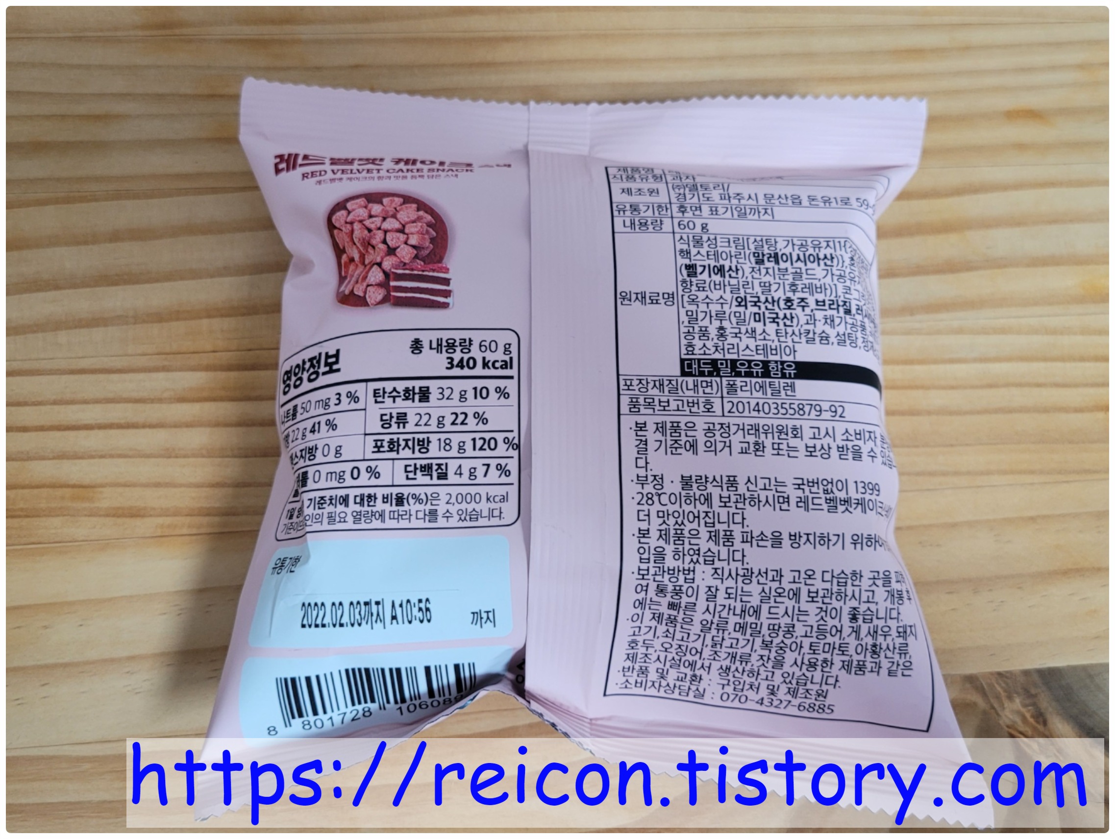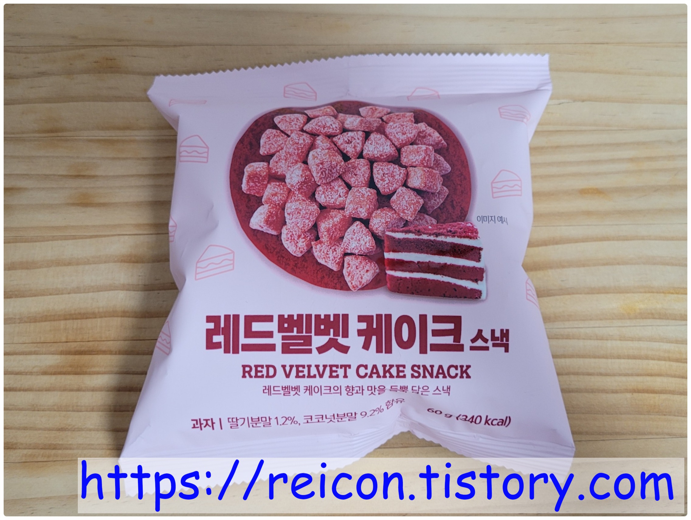 '레드벨벳 케이크 스낵'답게 케이크 한 조각을 본뜬 듯한 모양이네요.