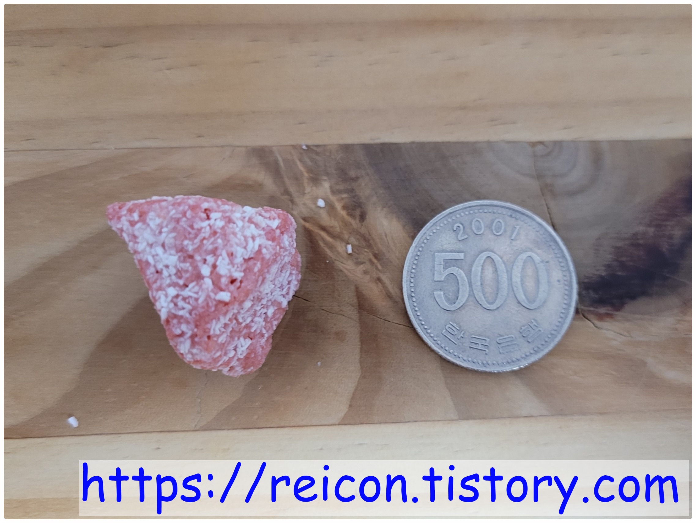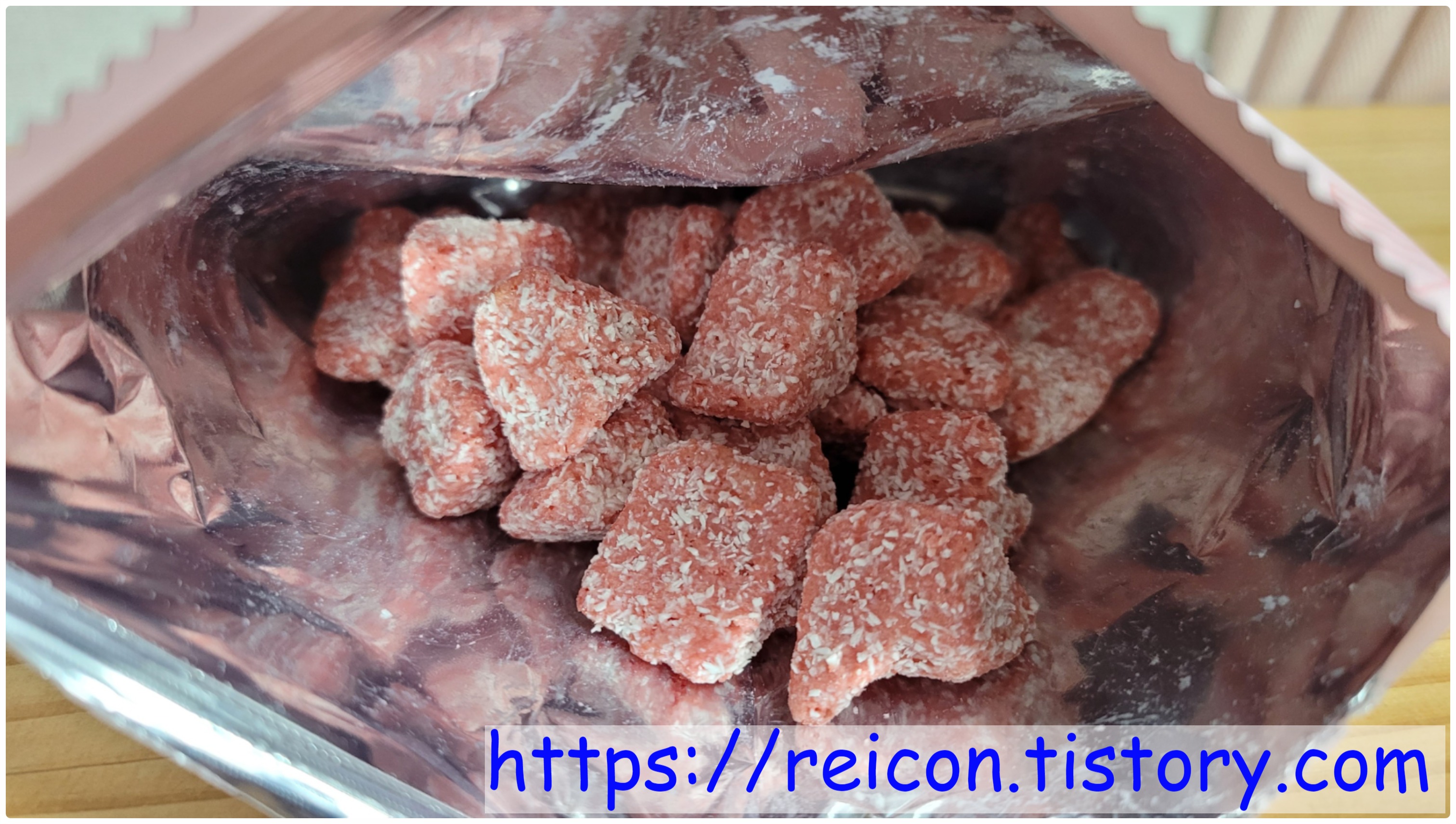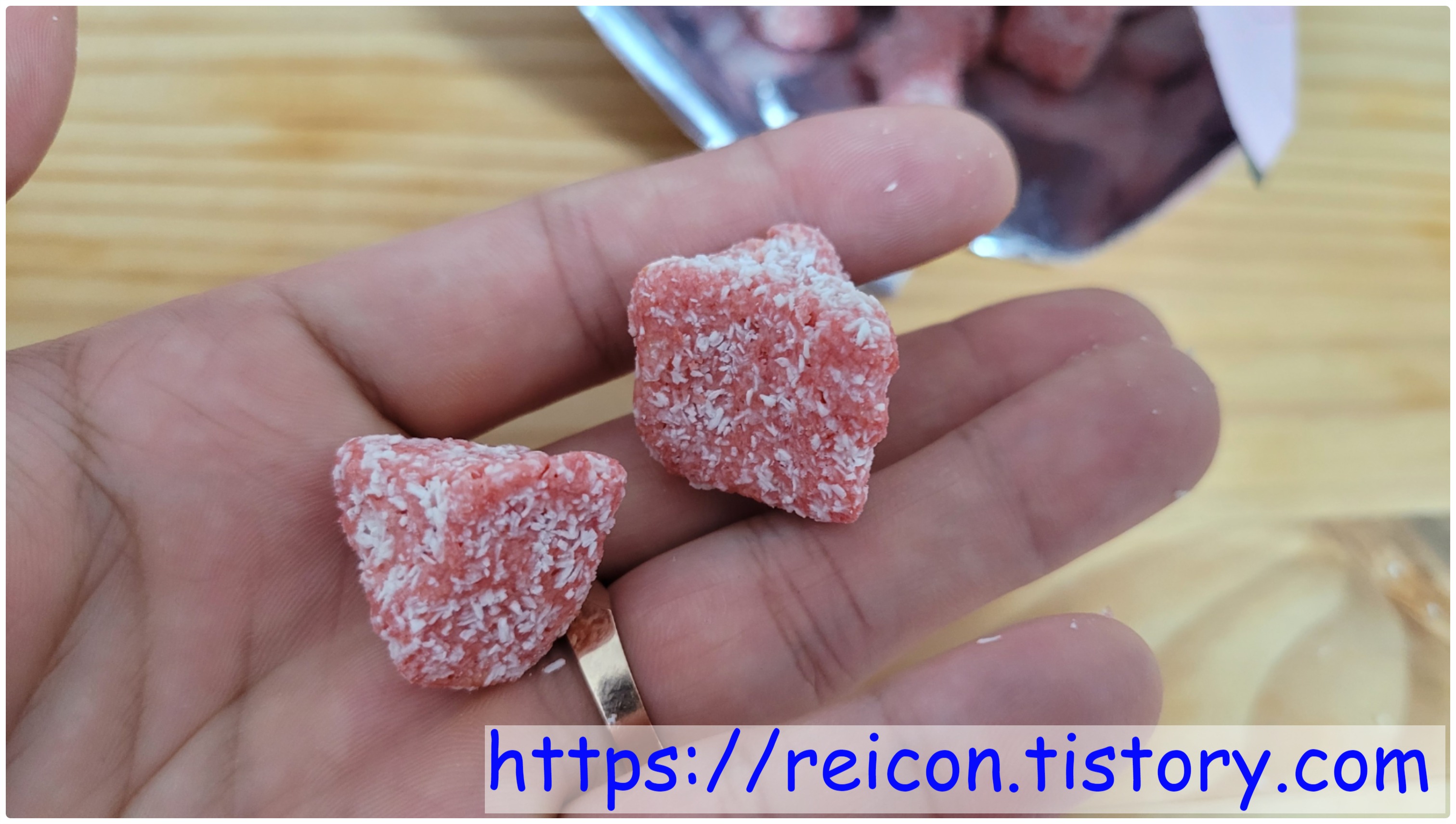 CU에 있는 '하늘의 별딸기'가 생각나지만 그보다 비교적 맛은 덜한 뭔가 아쉬운 맛이기도 했고, 하얀 가루는 씹는 식감이 나지만 별다른 맛은 나지 않아 마치 도넛에 뿌려진 하얀 가루의 식감이 나기도 했구요.
