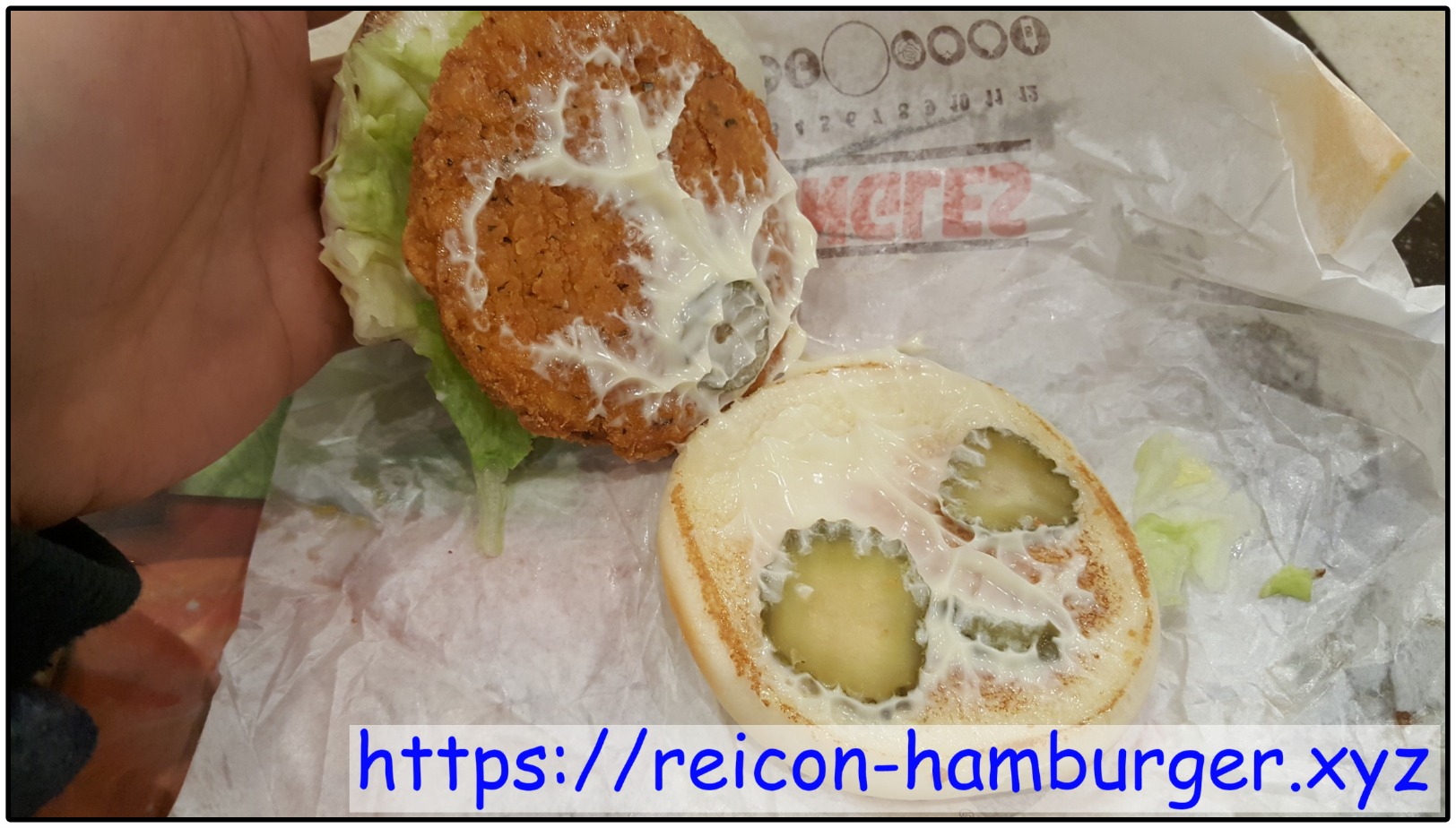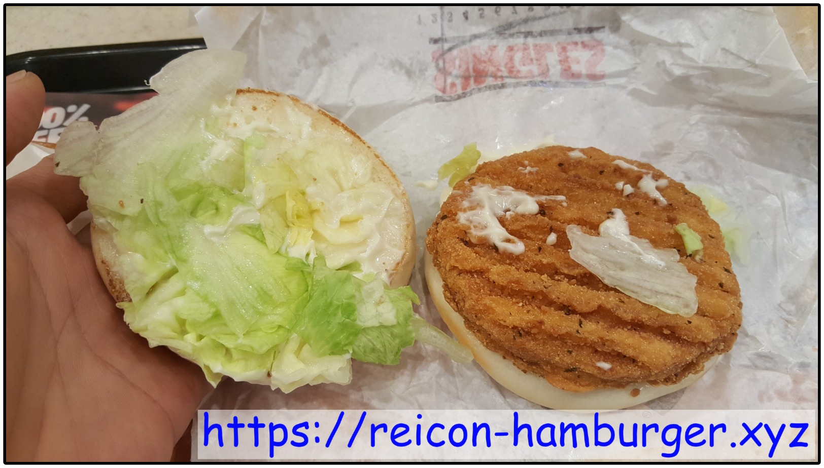 치킨 패티는 바삭한 느낌이 아주아주 조금 나면서 텁텁한 식감이고, 삼삼한 맛이긴 하지만 마요네즈와 만나는 순간 다시 느끼함이 올라오는 맛이구요.