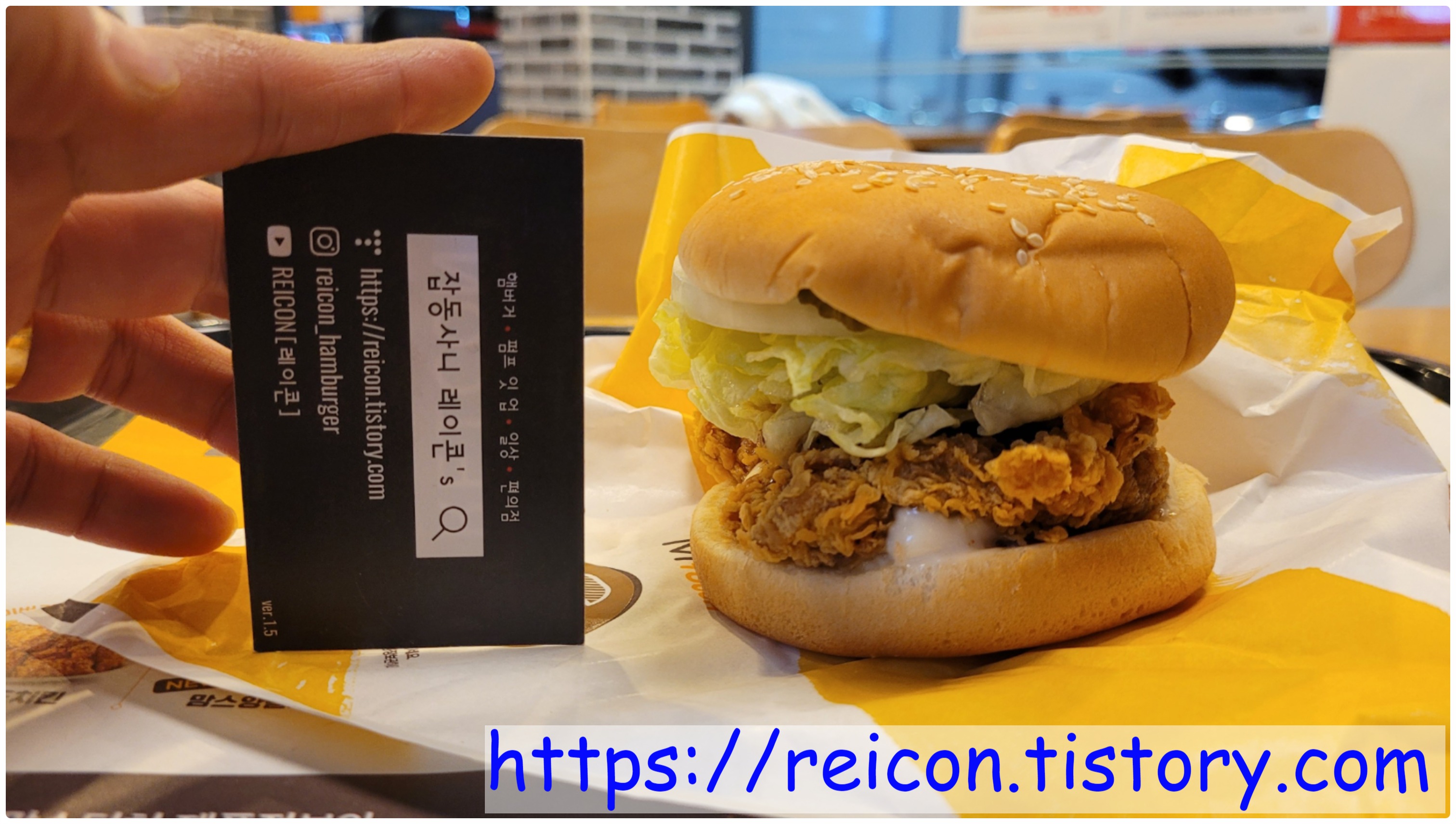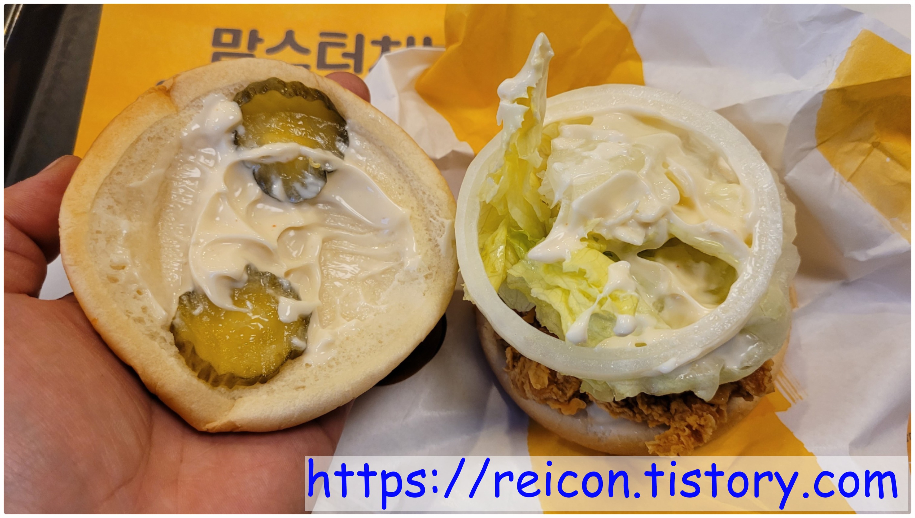 게다가 양파의 알싸한 맛은 옅게 퍼지며 육즙이 가득한 패티와 합쳐져 양파닭을 먹는 느낌이 났는데, 치킨의 맛이 과하지 않고 다른 재료들과 조화가 잘 되었구요.