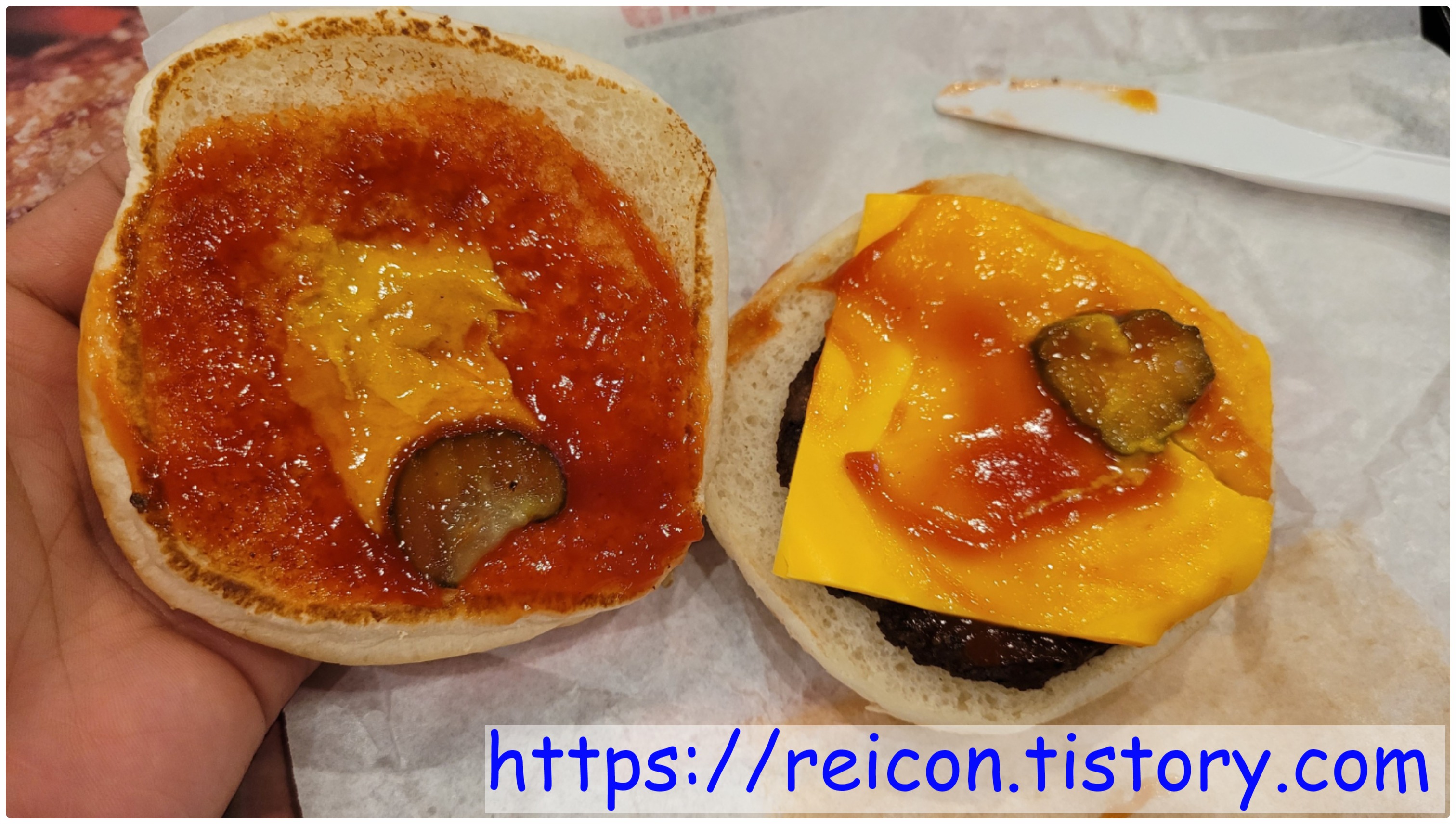 치즈맛은 담백하게 패티에 흡착이 되지만 케첩이 피클과 섞여 신맛이 강하다는 느낌을 많이 받았고, 결정적으로 기본적인 양상추나 양파도 들어가지 않은 탓에 빵이 엄청 뻑뻑한 느낌이 많이 들었네요.