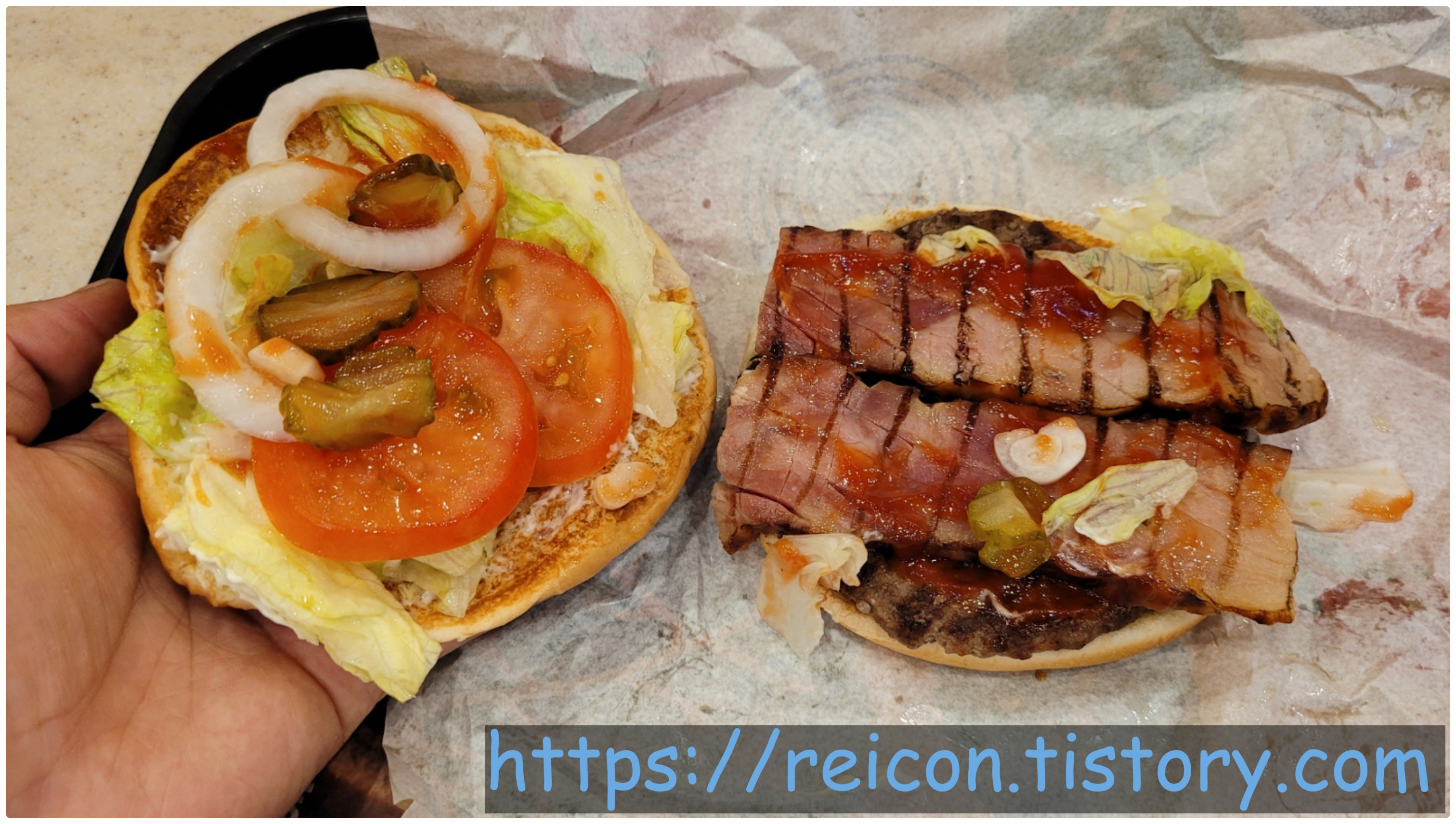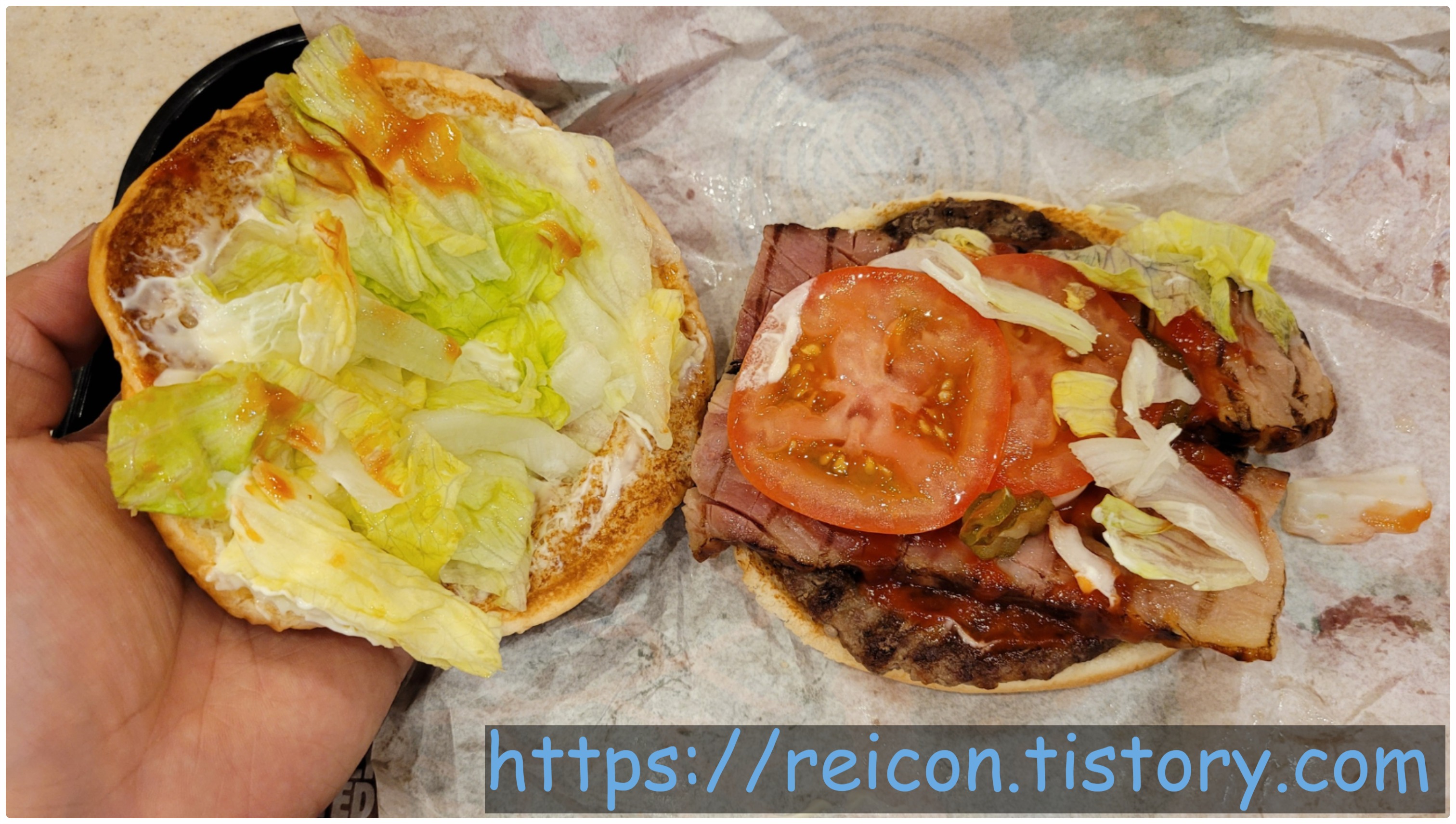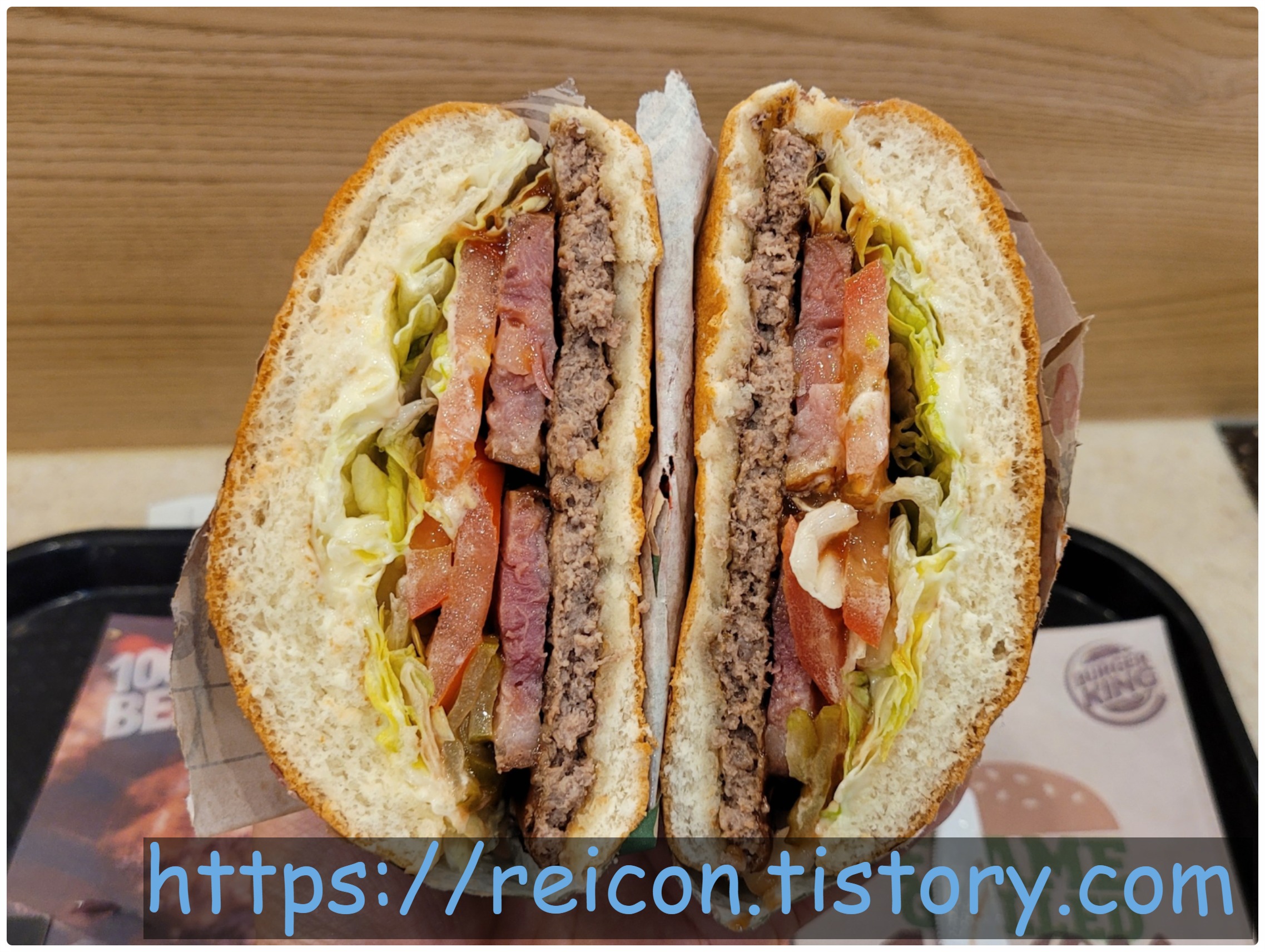 베이컨에 신경을 많이 썼을 것이라는 생각을 했지만, 그와 동시에 와퍼와 비슷한 구성을 보고는 '그냥 와퍼보단 맛있겠지만 기대를 할 만한 정도는 아니겠지'라는 생각이 매우 가득했습니다. 와퍼보다 맛있으면 기대해도 되는데?