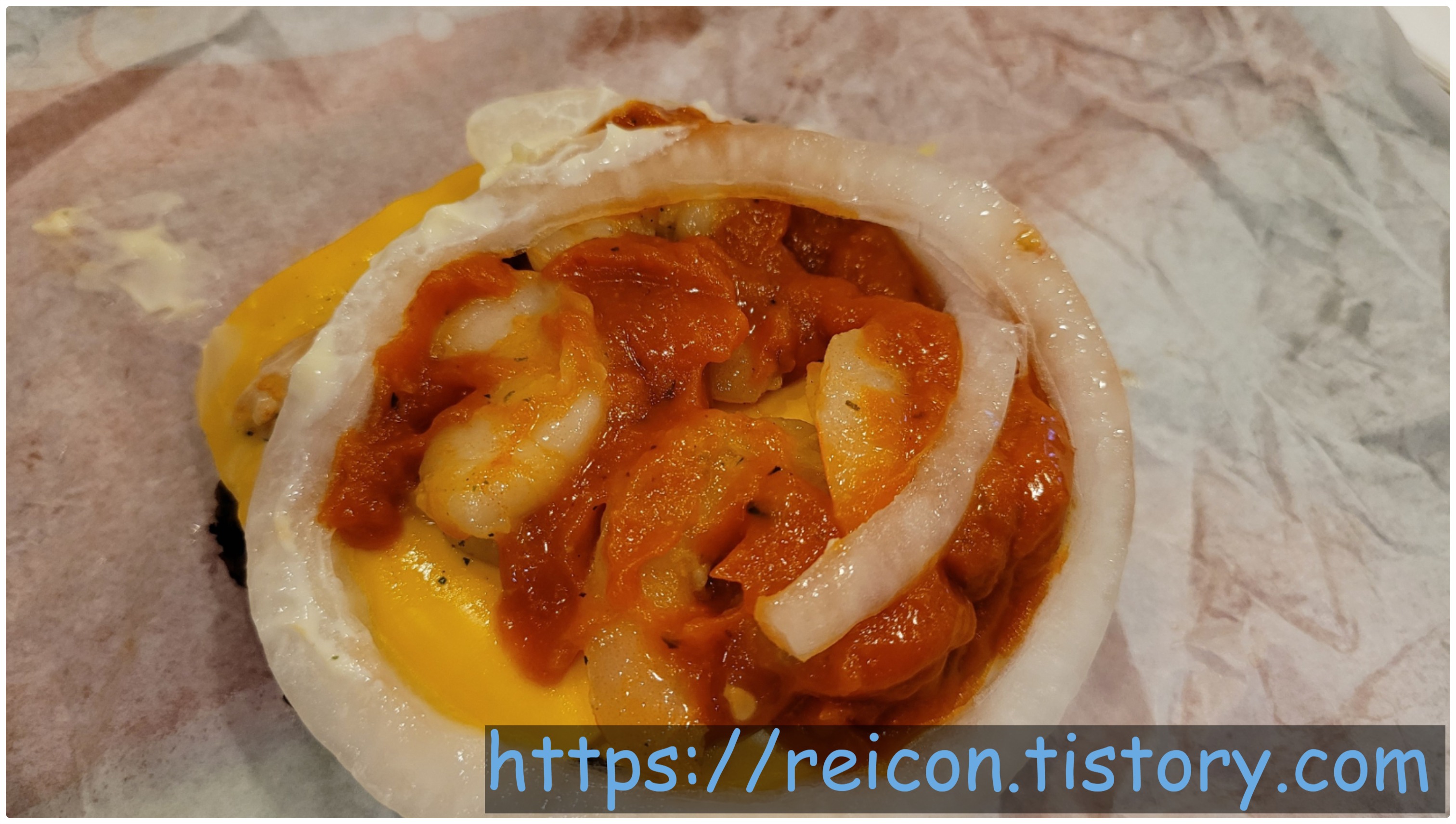 먹자마자 스파이시 토마토 소스의 매콤새콤한 맛이 토마토와 양파랑 어우러져 오리지널 와퍼에서 느꼈던 그 감칠맛을 아주 진하게 발산하는데, 통새우의 탱글탱글한 식감과 특유의 맛이 살아있어서 고급진 파스타를 먹는 느낌으로 시작합니다.