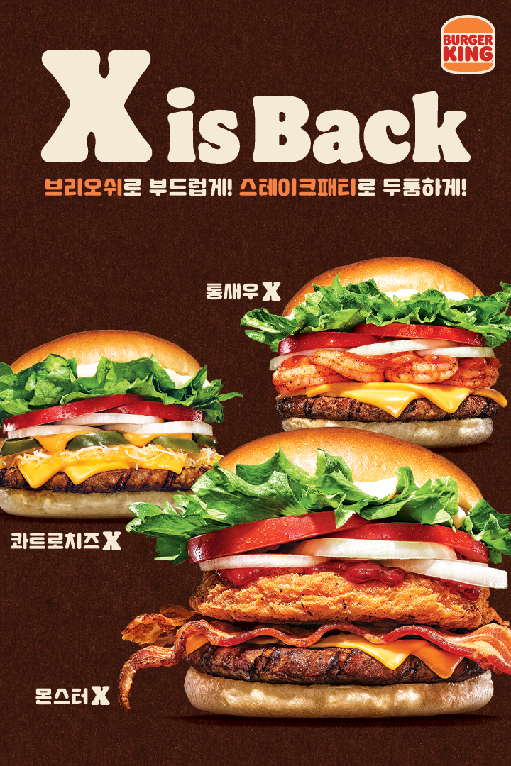 그리고 부활도 조금 특이하게 했는데, 몬스터 X는 이름 그대로, 콰트로 치즈 X는 예전에 '더 콰트로 치즈 X'에서 번이 브리오쉬 번으로 바뀌었고(아주 예전에 오리지널도 있긴 했지만), 통새우 X는 '통새우 스테이크 버거'에서 드디어 X 시리즈로 들어가게 되었죠.