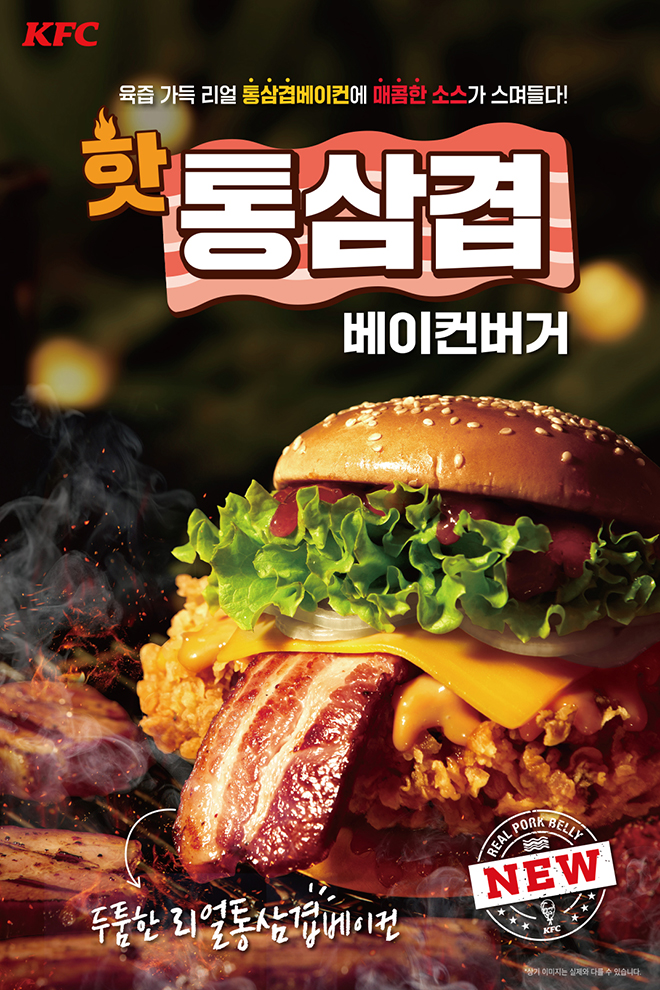 통베이컨이 추가된 KFC의 새로운 시도 '핫 통삼겹 베이컨버거'.