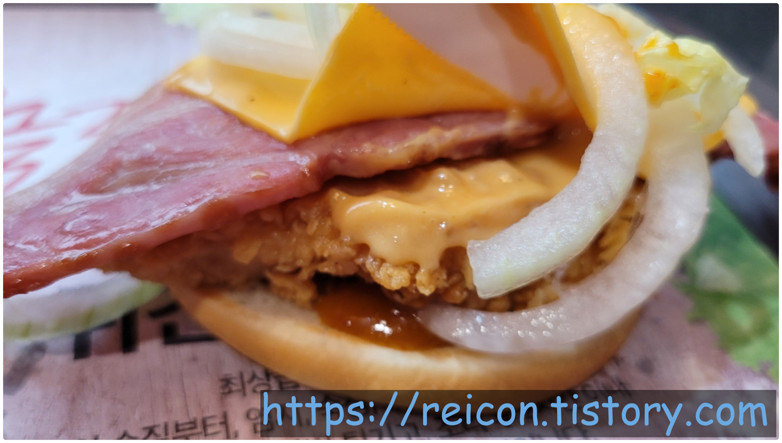 통삼겹 베이컨과 치킨패티의 조합으로, 처음보는 매콤한 소스도 들어간 구성이네요.