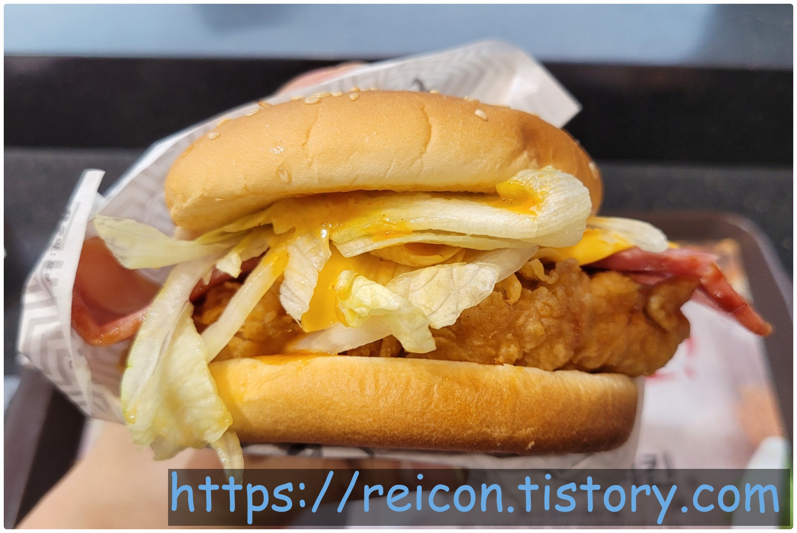 그래서 상대적으로 치킨 패티가 퍽퍽한 느낌이 강했던 것은 단점이지만, 두 가지의 재료의 풍미로 조화가 되면서도 매콤한 소스와 베이컨이 감싸면서 더블 패티같은 두툼함이 느껴지기도 했구요.