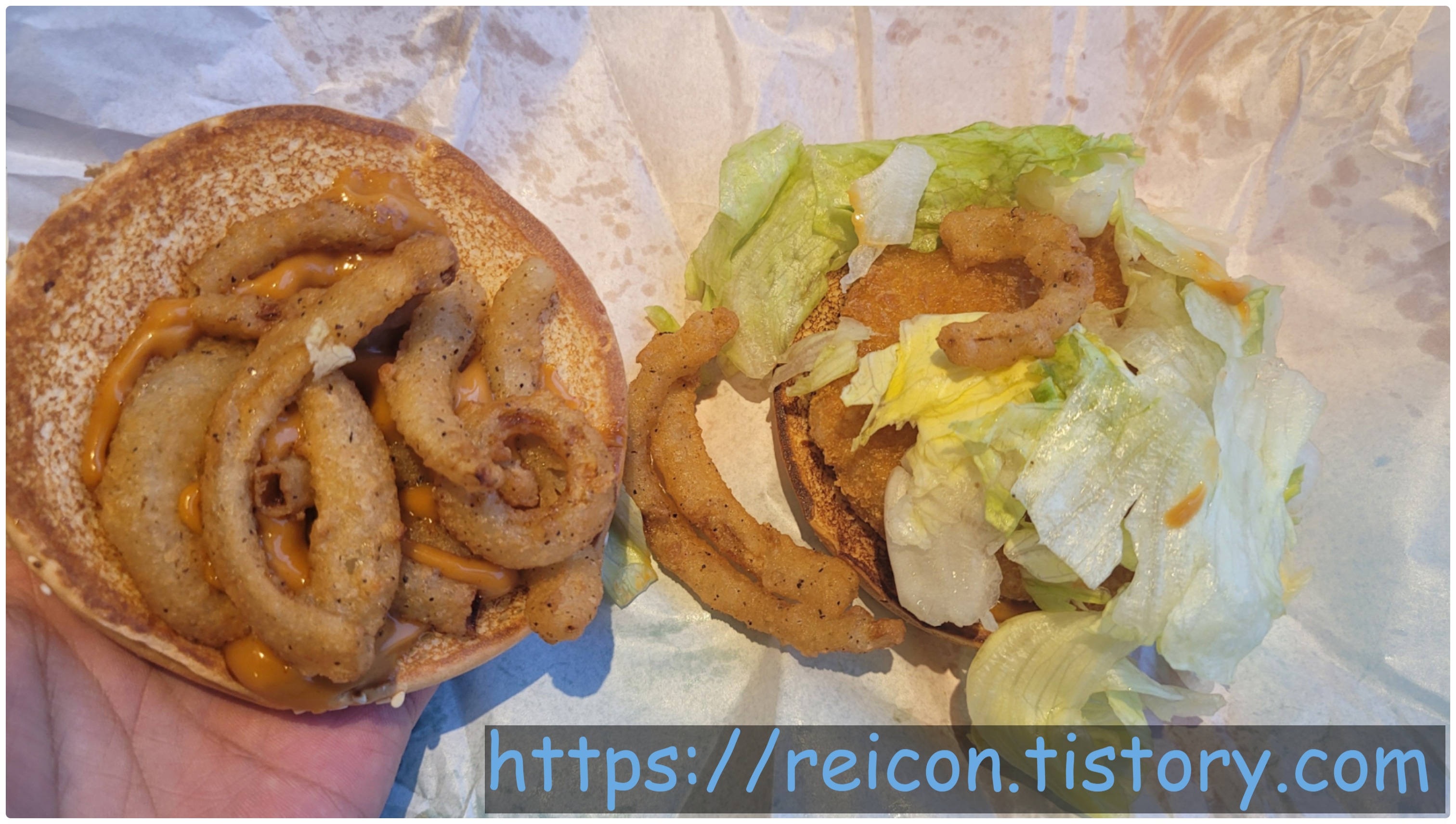 먹자마자 스파이시 어니언 소스의 매콤함과 특유의 감칠맛으로 기분 좋게 다가오며, 거기에 새우 패티 튀김옷의 바삭함과 고소함이 확 올라오는 맛으로 시작됩니다.