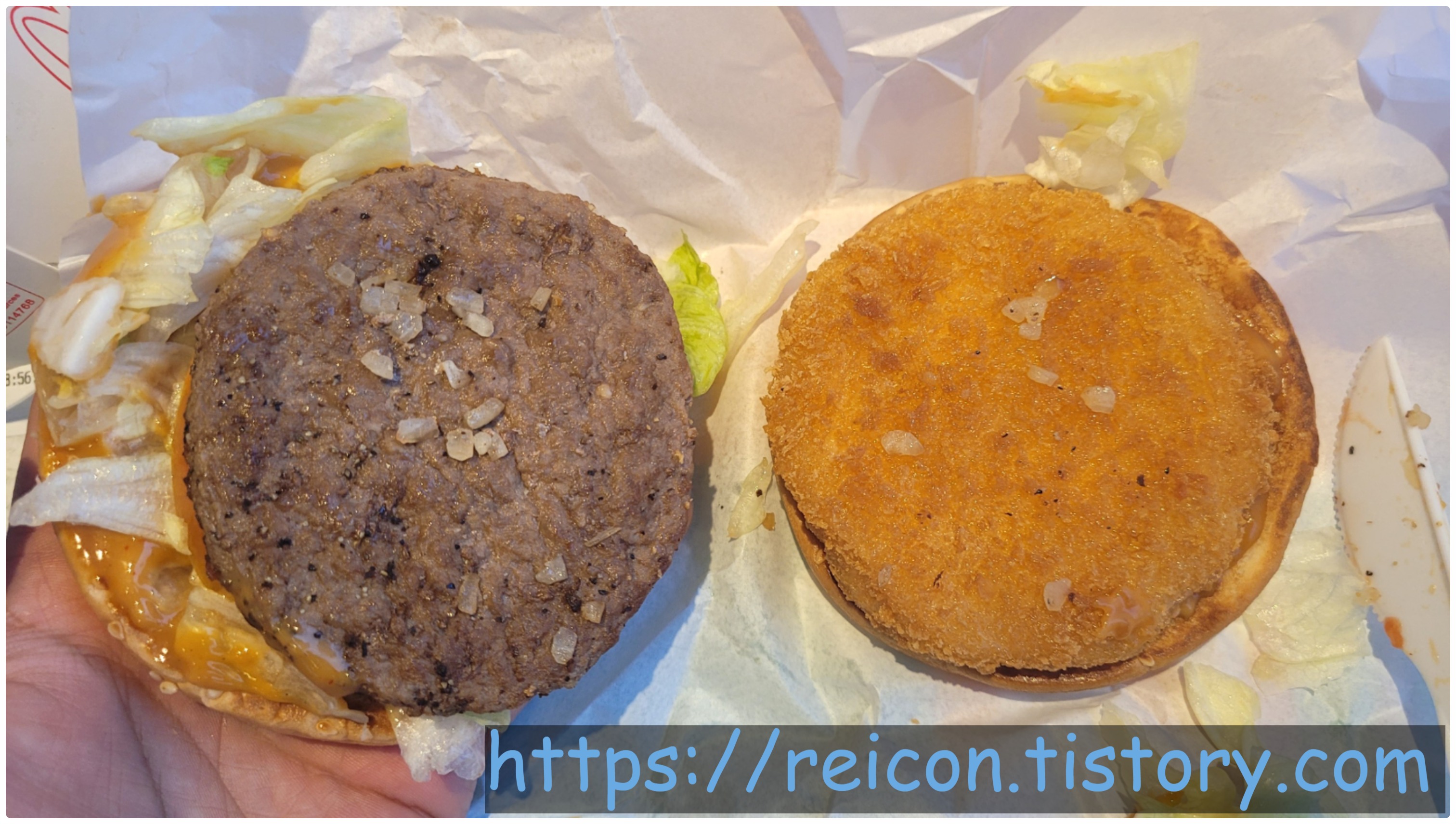 두 가지의 패티가 들어가며, 존재감이 없는 다진 양파도 들어가는 구성이네요.