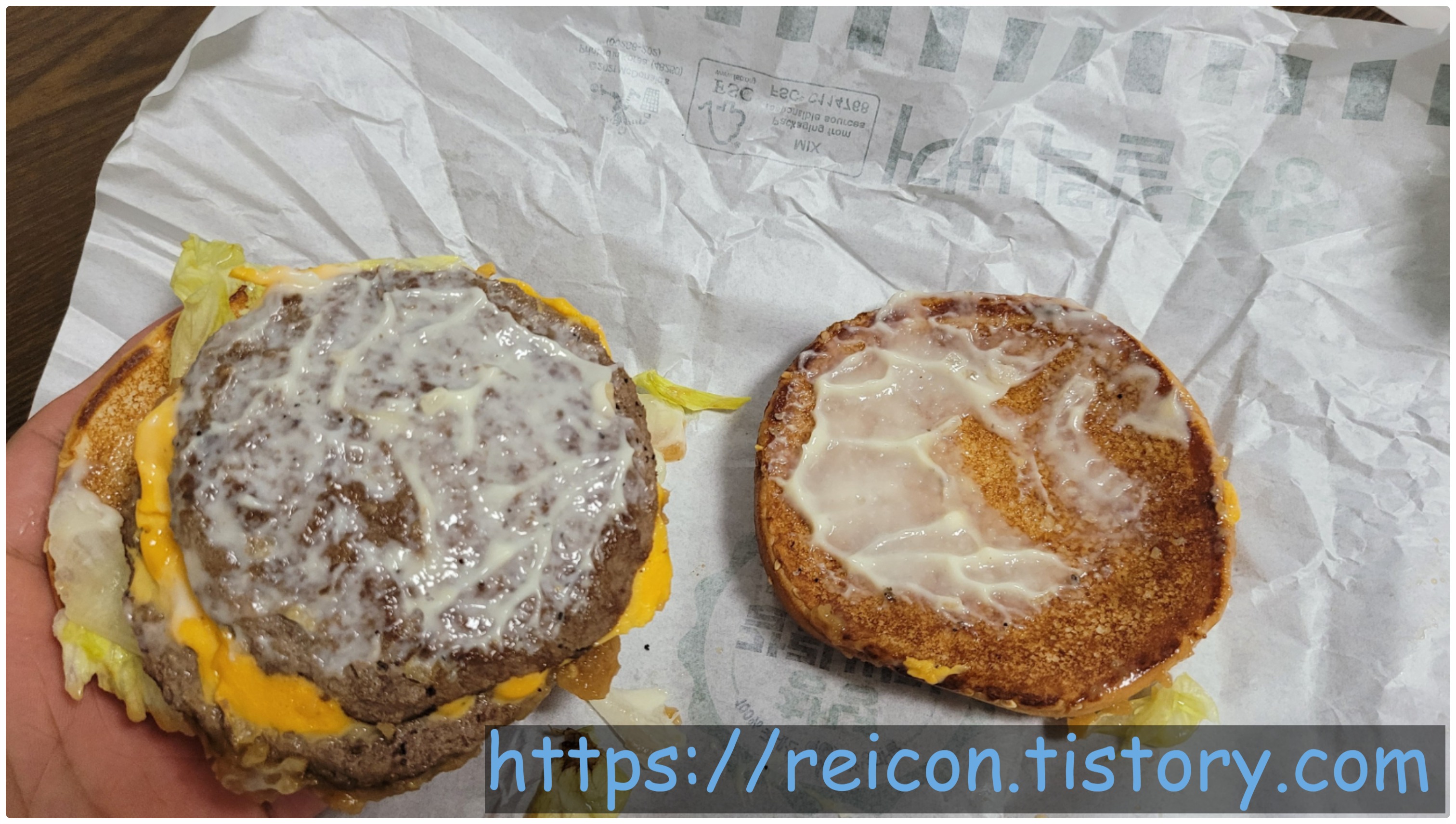 게다가 토핑 소스의 달달함까지 섞여서 감칠맛이 더더욱 폭발하였고, 거기에 더블 패티 특유의 묵직한 식감과 깊은 향으이 조화가 되기도 했구요.