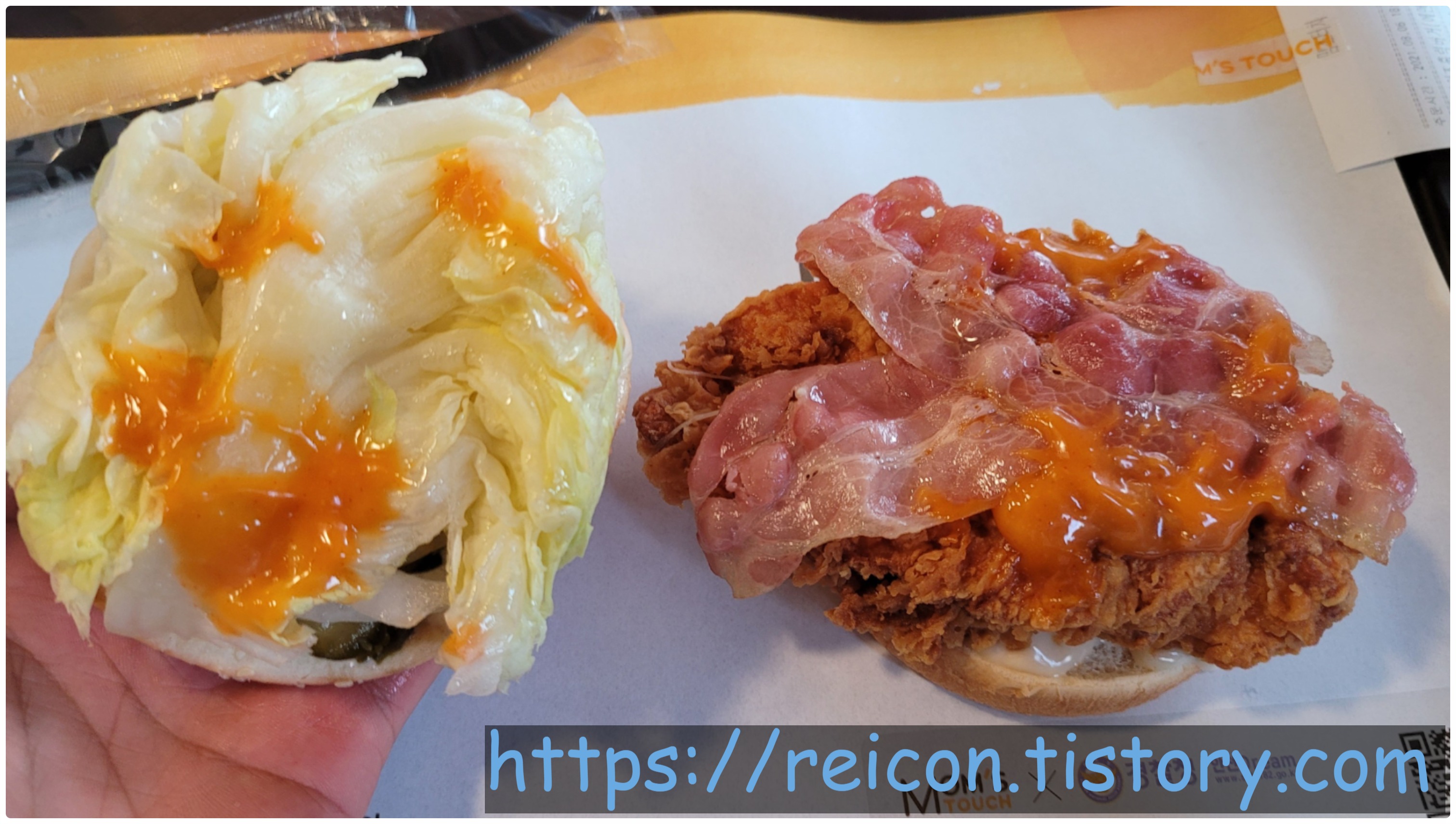 거기에 매콤새콤한 마요 소스로 느끼함을 잡아주면서도 입맛이 당기는 매콤함으로 또다시 홀릭시켰으며, 패티는 통가슴살 특유의 묵직한 식감과 통살(닭다리살) 패티라고 착각이 들 정도로 육즙이 가득 머금은 부드러운 식감이 공존하는 더블 패티의 느낌도 나면서 특유의 담백함이 극도로 나며 완전히 홀릭시켰구요.