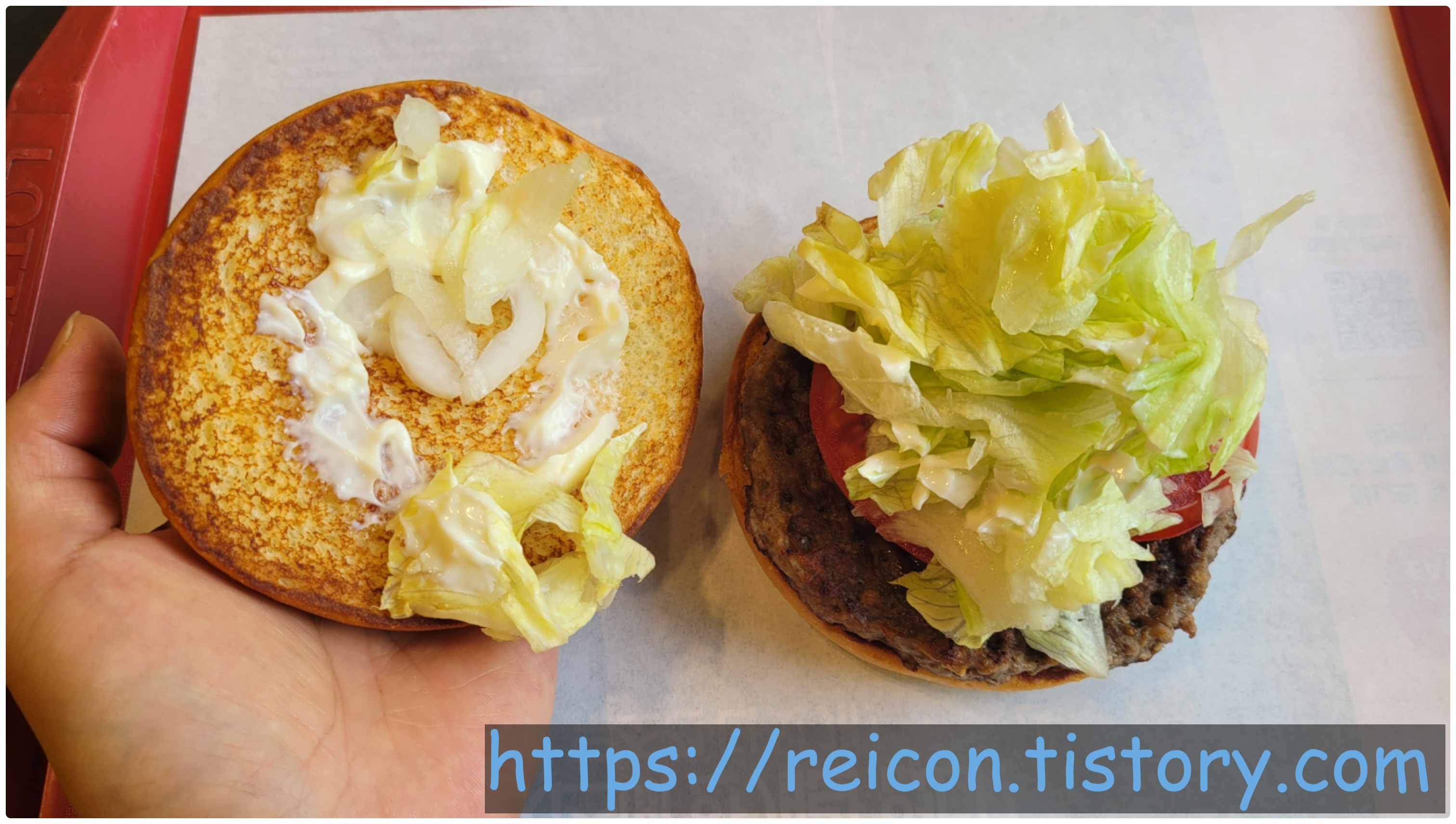 소스가 지나치게 많이 늘어나서 전체적으로 짠맛이 너무나도 진해졌으며, 그로 인해 패티의 풍미가 소스로 뒤덮여 금방 죽어버리는 단점이 있었네요.