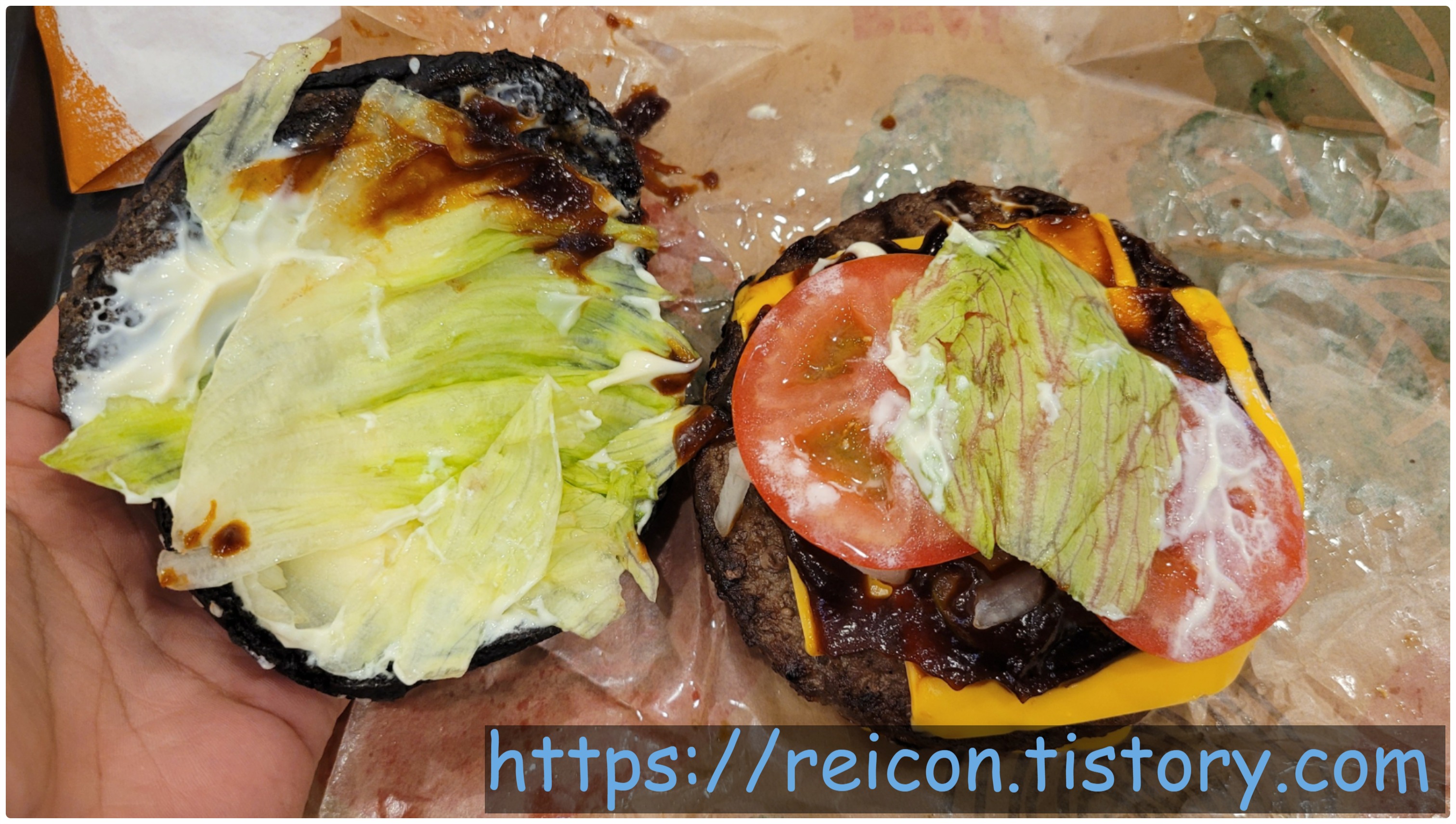 다만 당연한 말이지만, 패티가 너무 과하다 보니 다른 재료들의 맛이 너무 늦게 올라왔으며, 마지막에는 끝끝내 물려버려 남겨야되나 고민을 할 정도가 될 정도였네요.