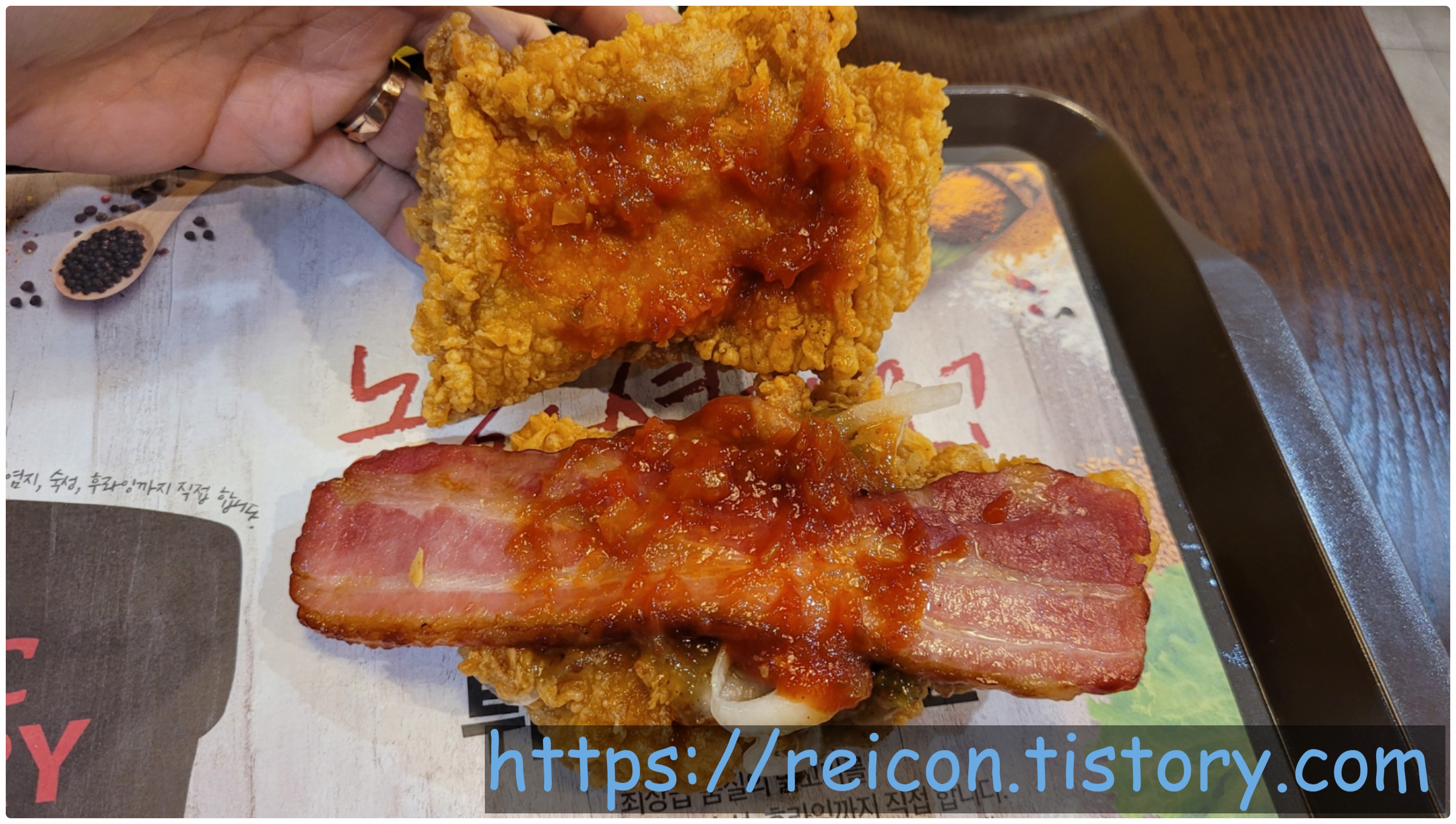 번 역할을 하던 치킨이 패티가 아닌 블랙라벨치킨으로 바뀌었고, 베이컨은 통베이컨으로, 그리고 할라피뇨 갈릭 소스가 추가된 구성이네요.