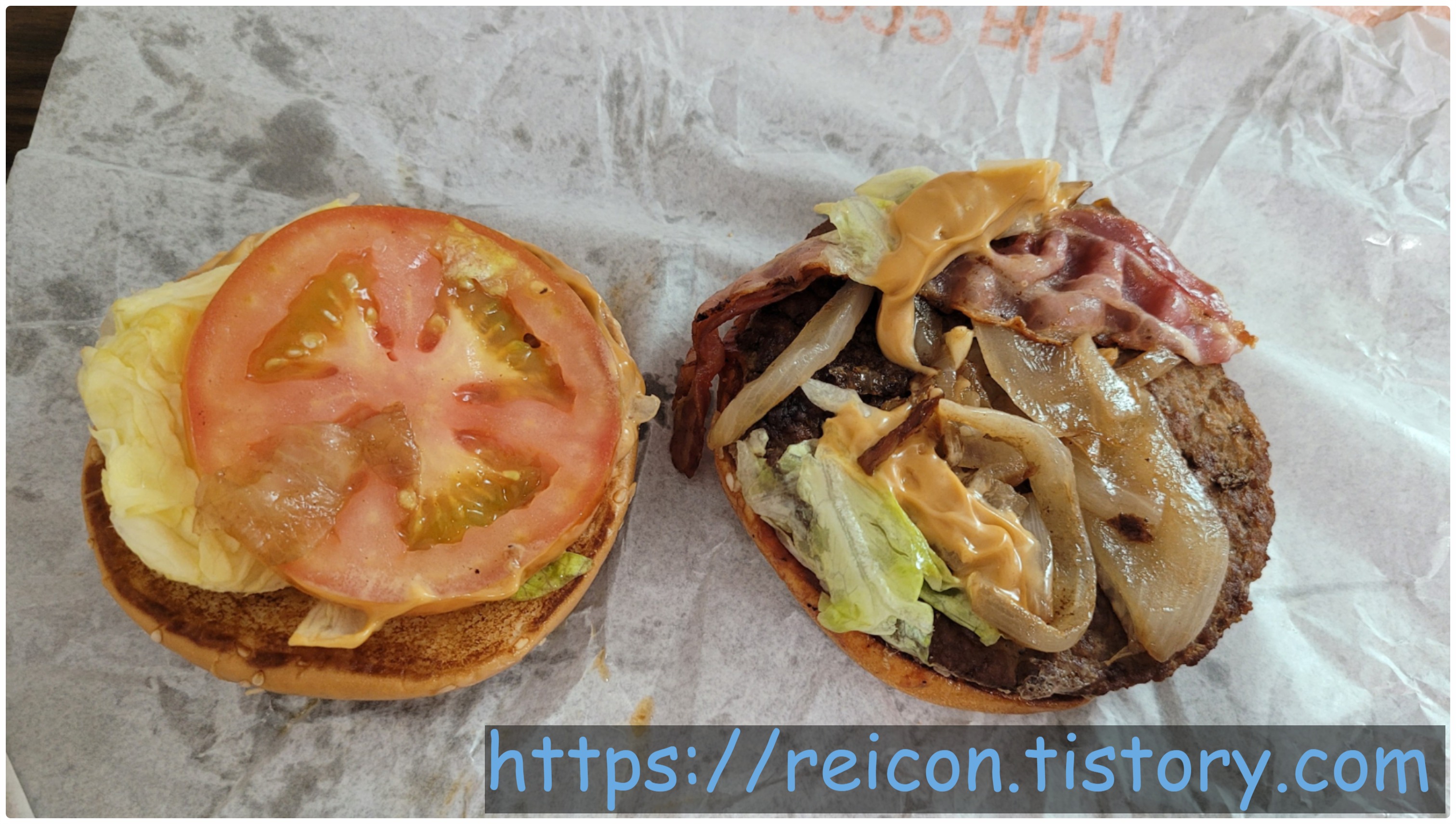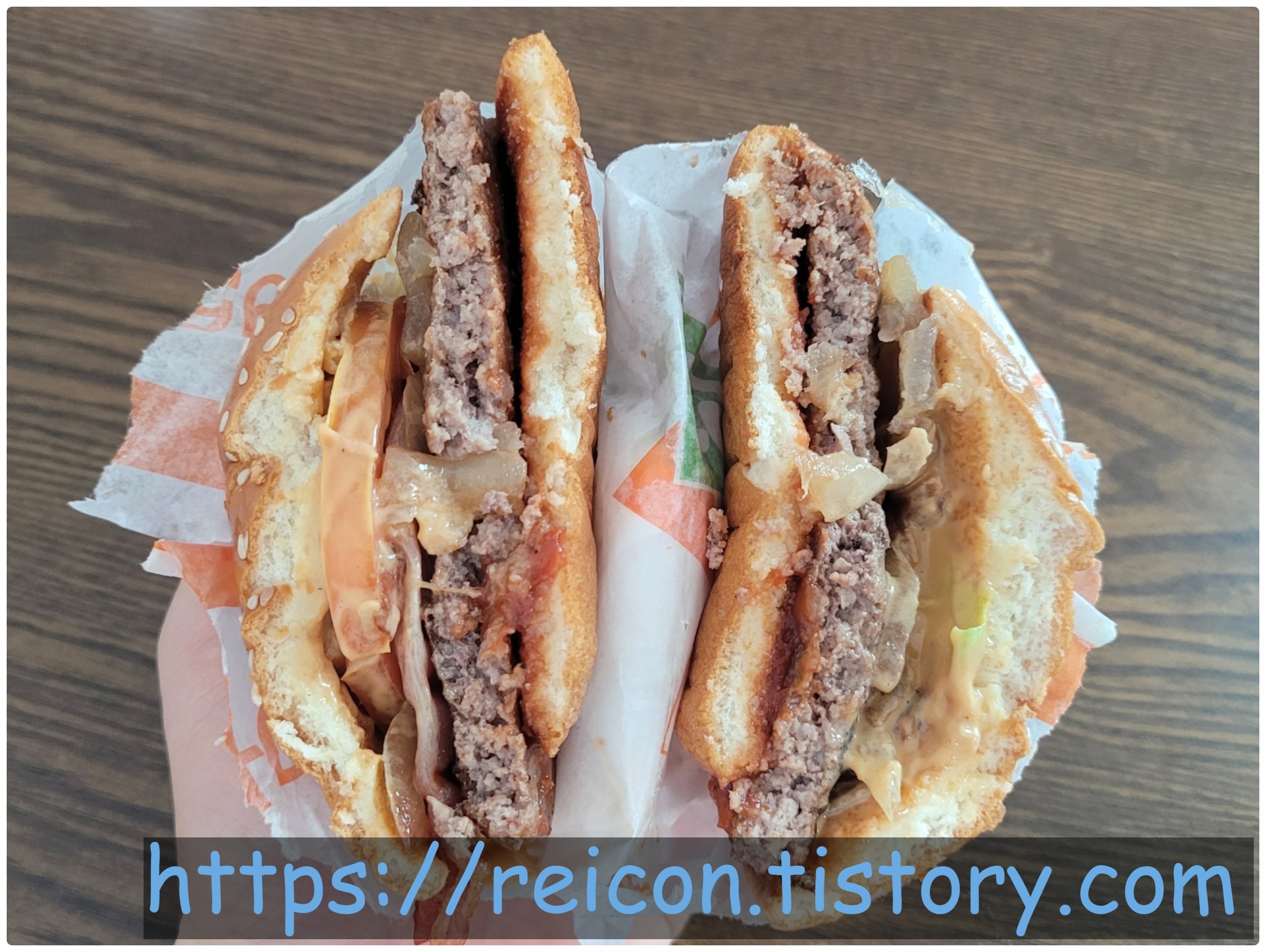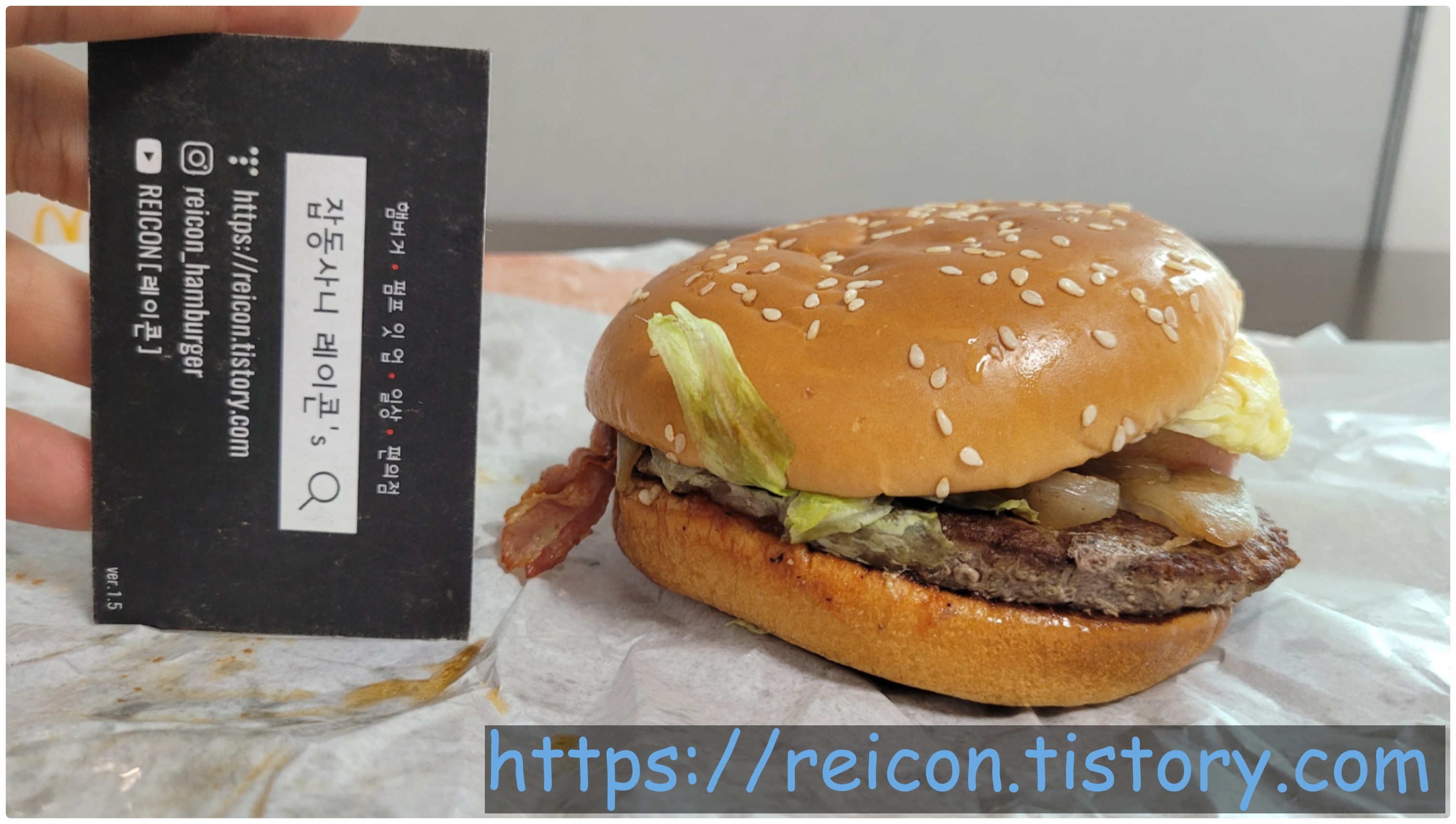 먹자마자 새콤달콤한 소스의 감칠맛에 제대로 나서 패티의 풍미를 더욱 진하게 해주는데, 거기에 살짝 질긴 식감의 베이컨이 풍미를 더하여 전체적으로 확 퍼지는 느낌이었습니다.