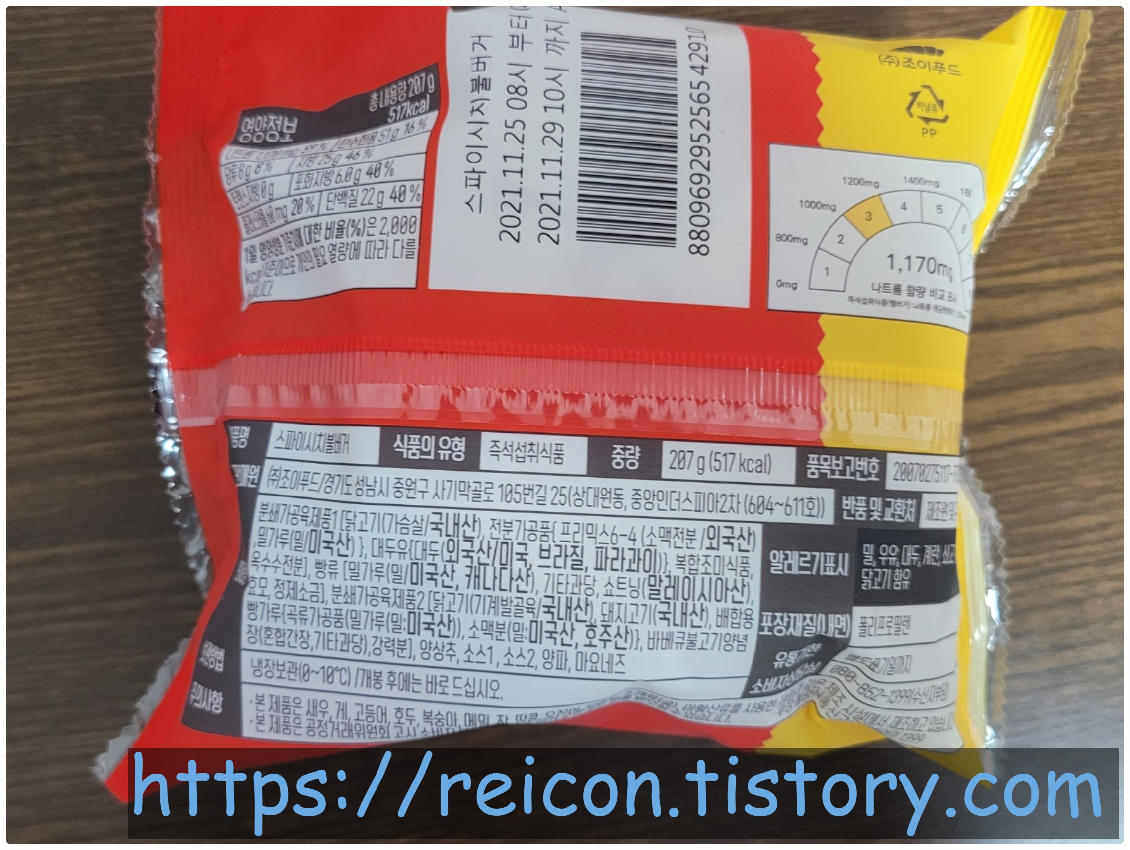 영양정보 : 중량 207g, 열량 517kcal, 단백질 22g, 나트륨 1170mg, 당류 8g, 포화지방 6g, 지방 25g, 트랜스지방 0g, 탄수화물 51g, 콜레스테롤 60mg