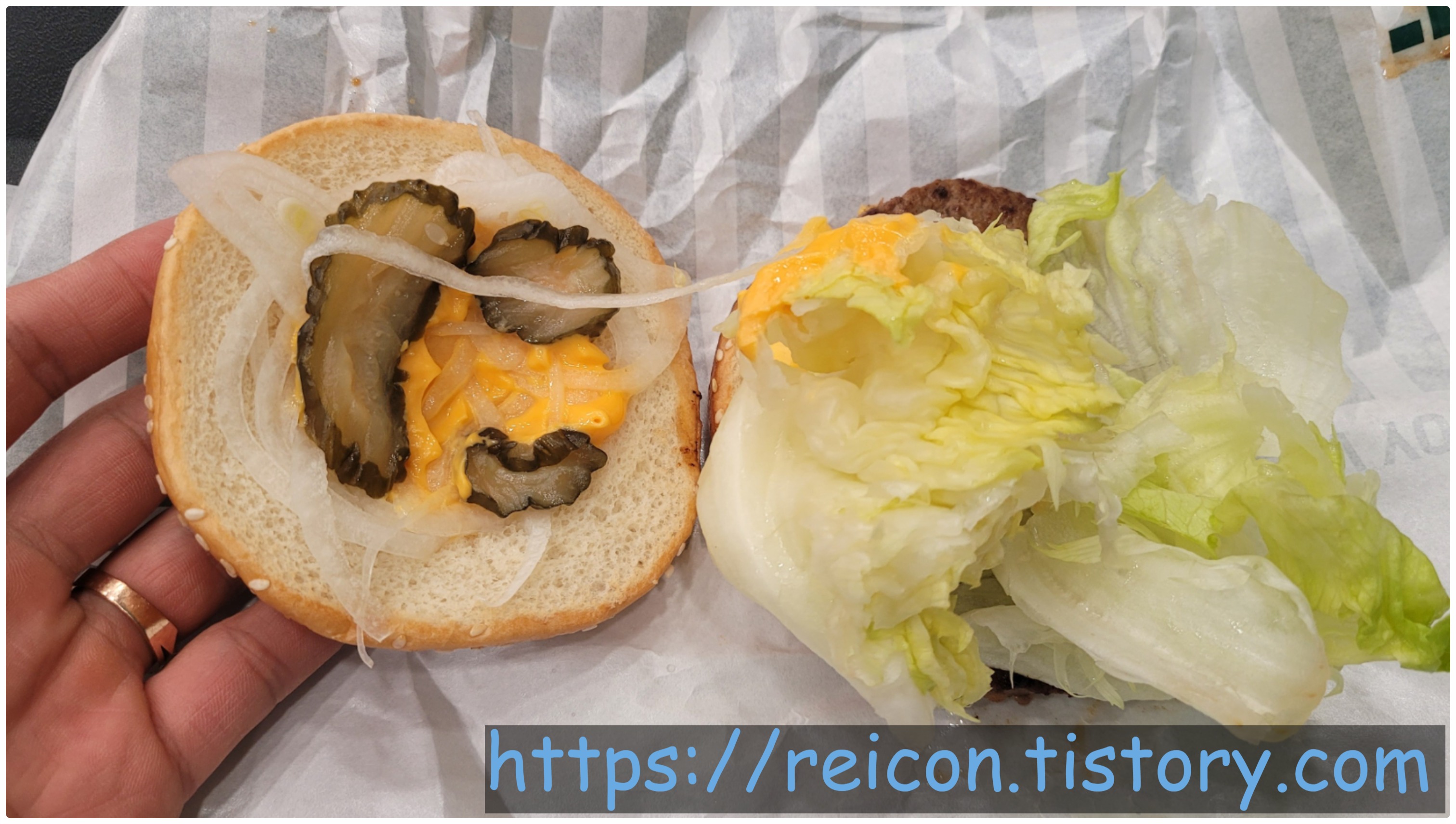 물론 아삭한 식감과 신선한 느낌의 양상추 덕에 기분 좋게 시작을 하며, 패티와 그 아래에 깔린 슬라이스 치즈가 조합이 되어 짭쪼름하면서도 담백한 맛이 제대로 였습니다.