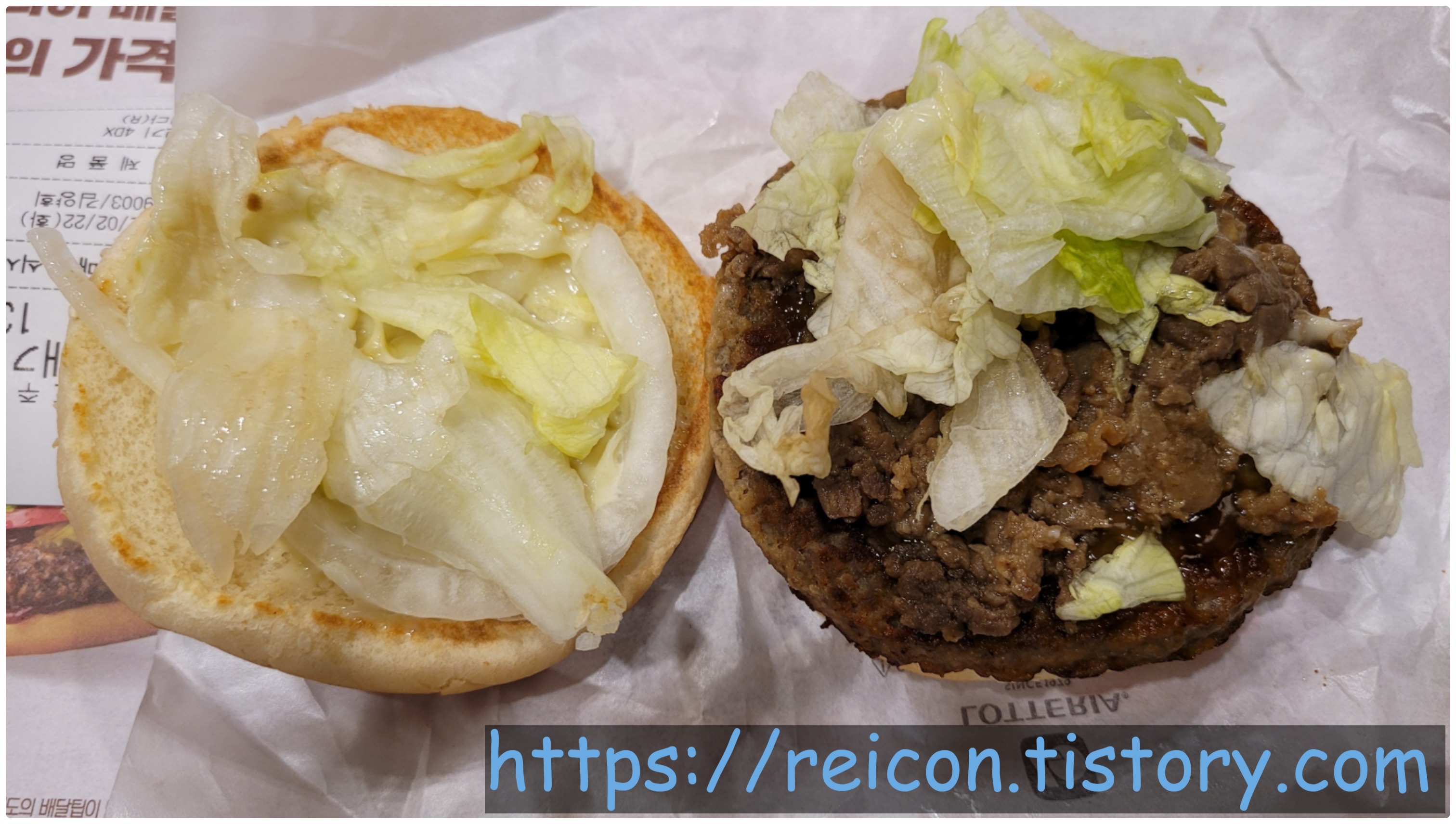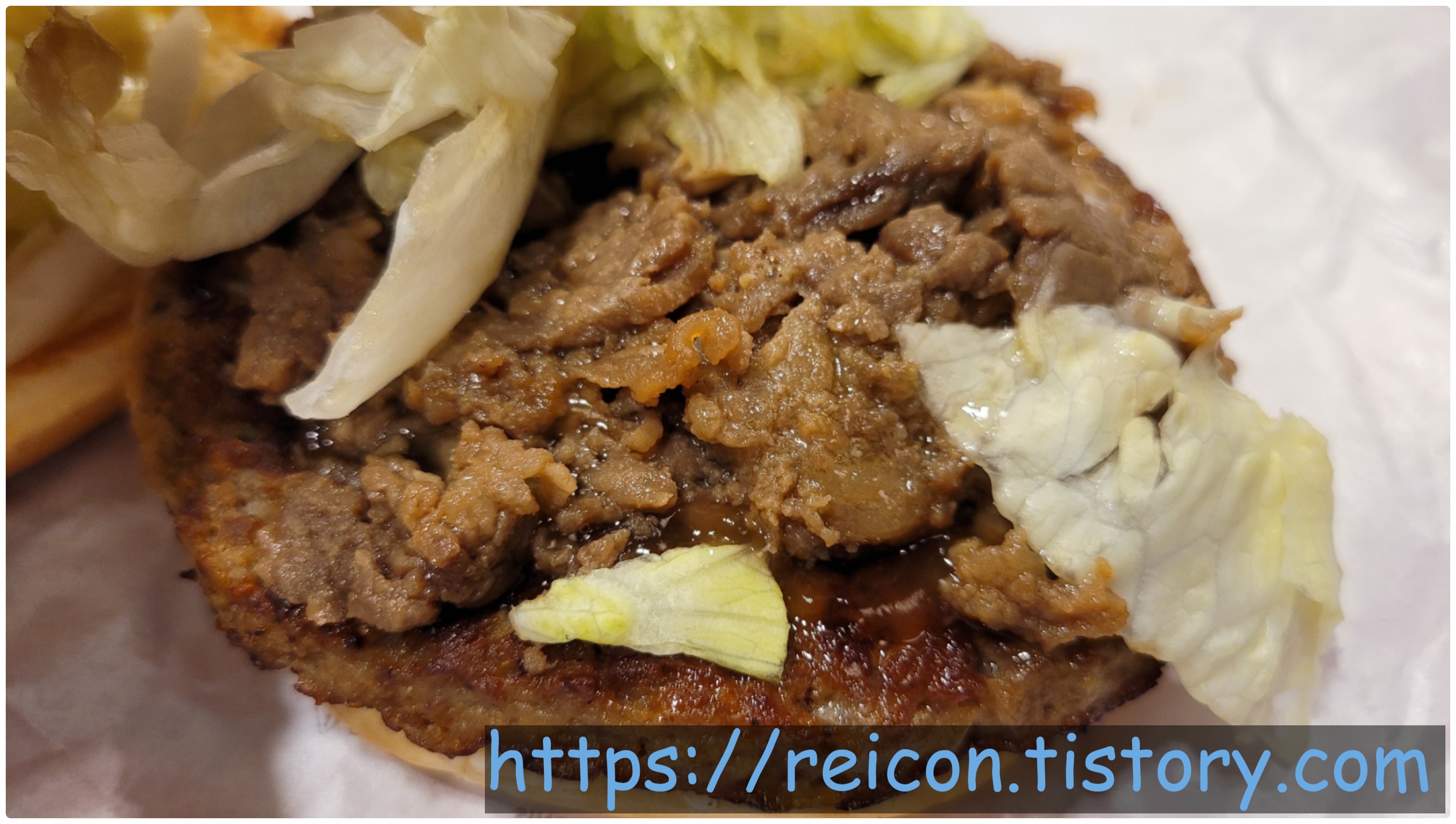 빵보다 큰 패티와 그 위에 비프불고기로 추정되는 고기 조각이 들어간 것이 보이네요.