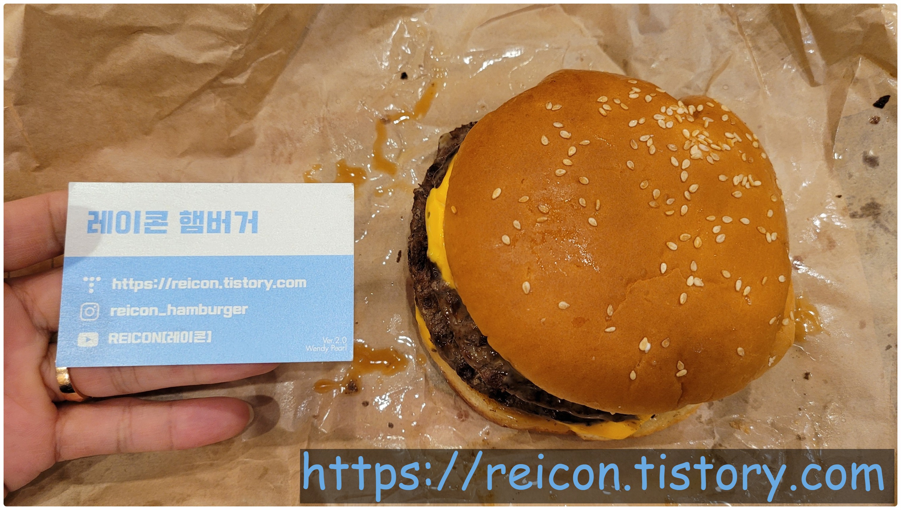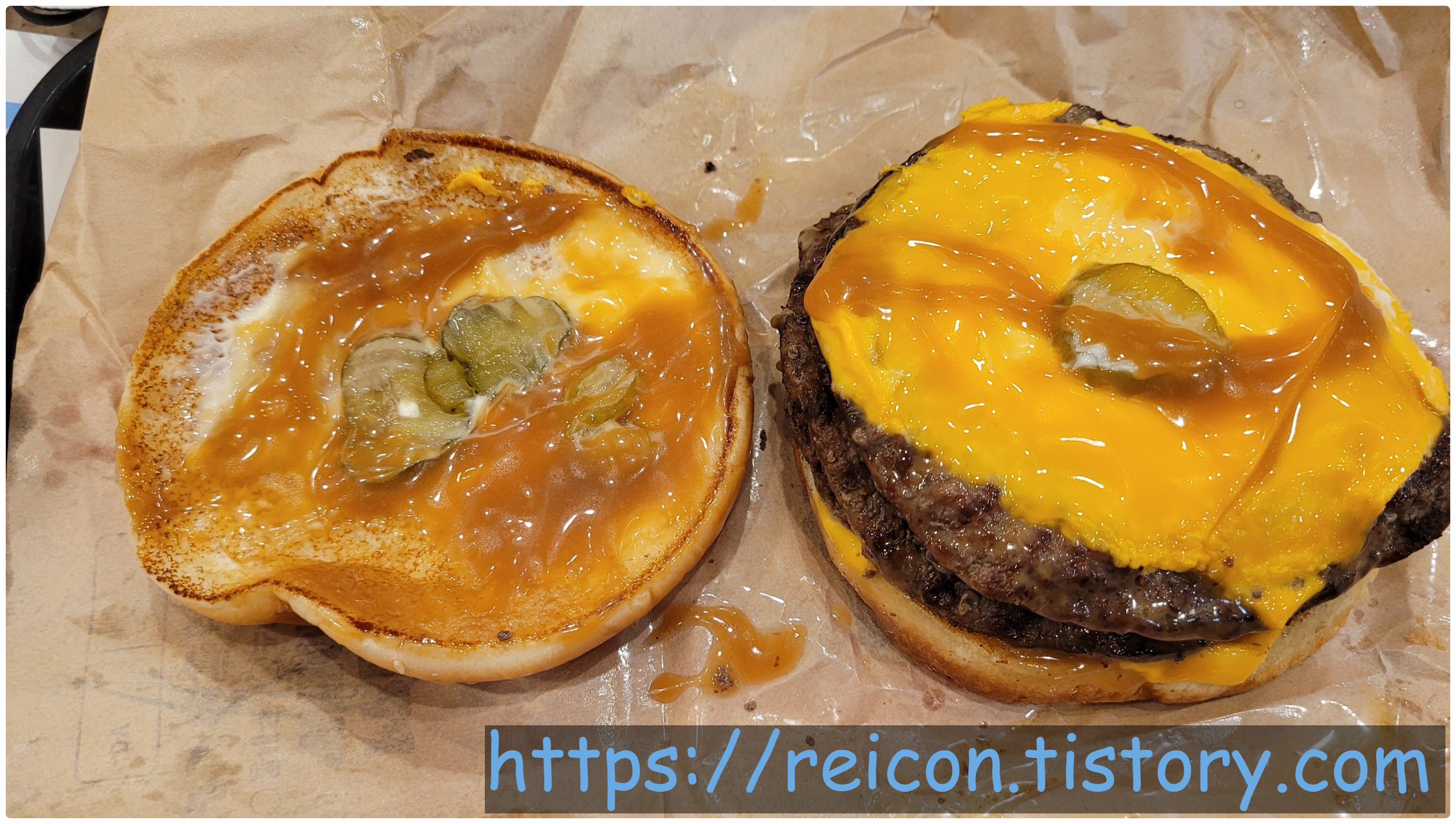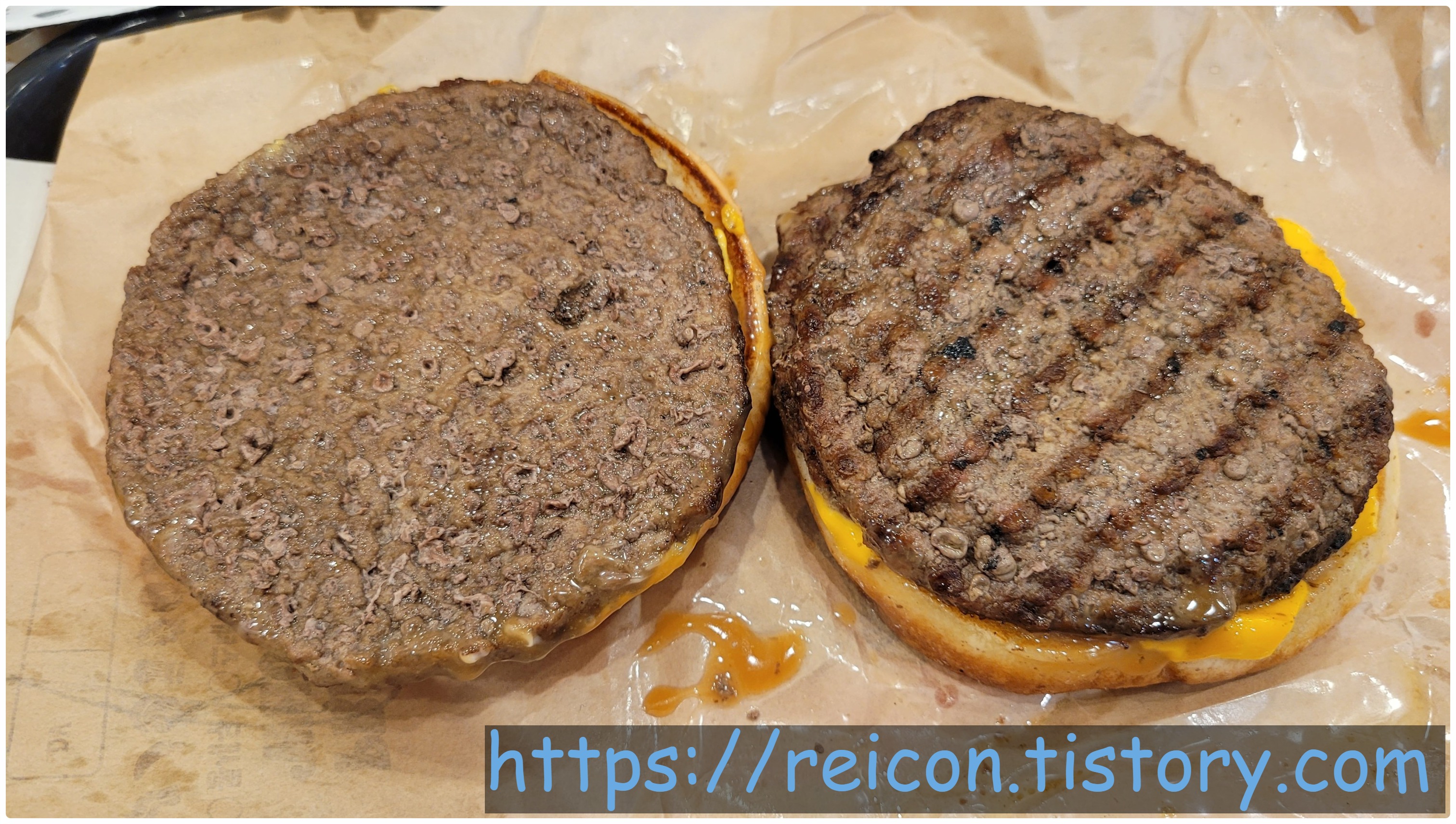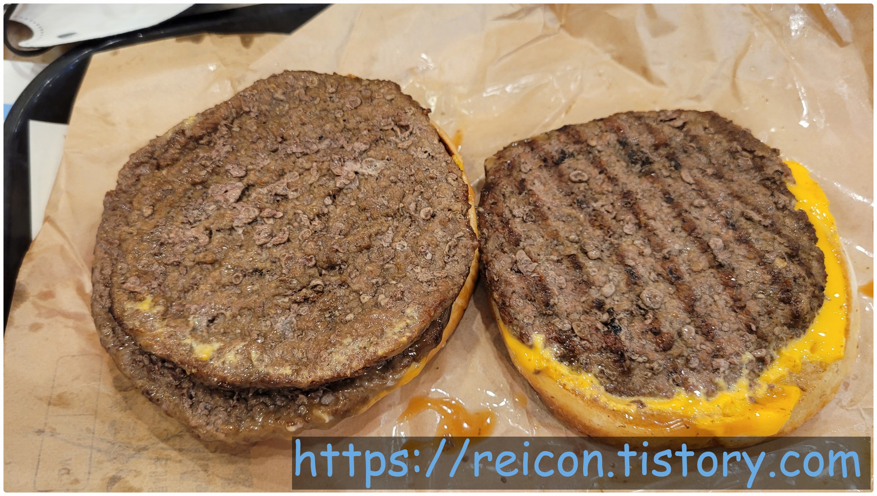 패티가 3장이 맞는데, 이상하게 2장같이 보이게 나왔네요;