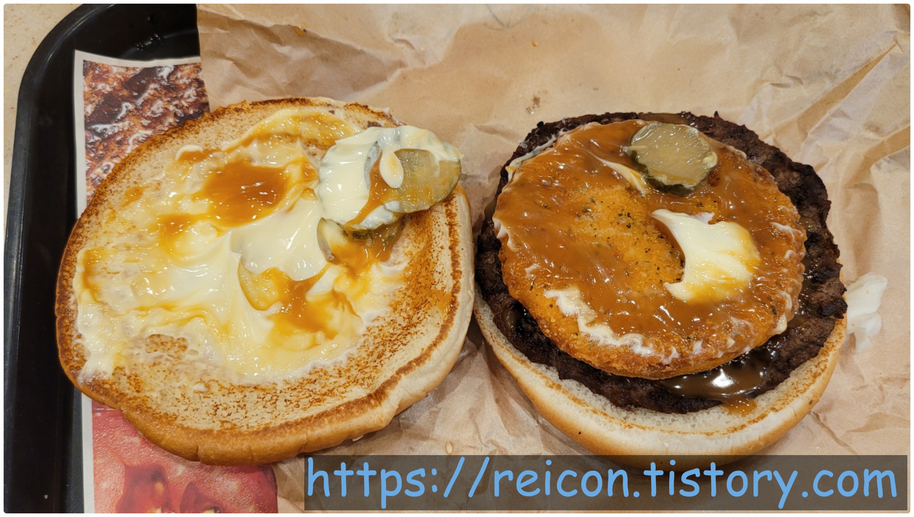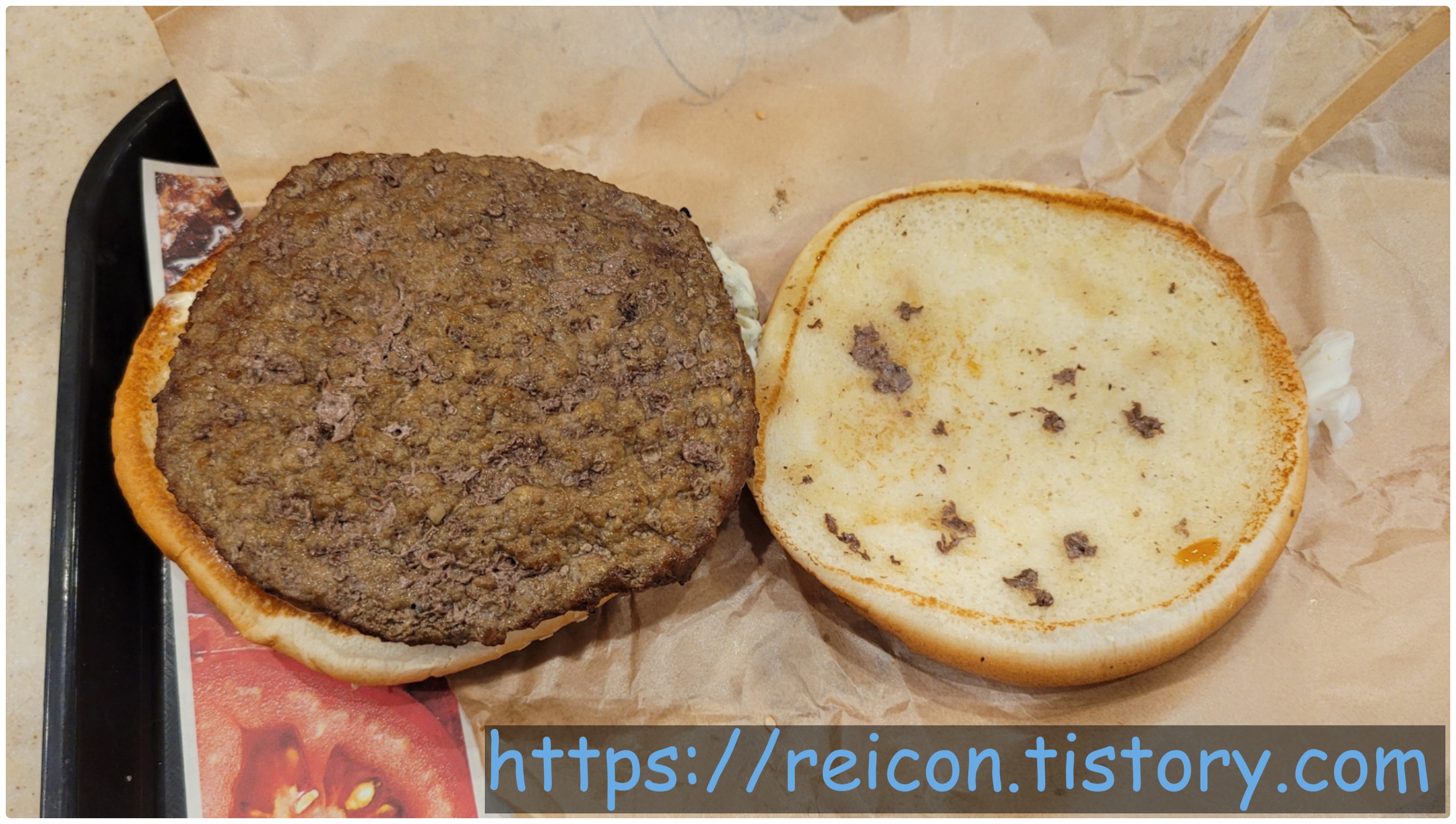 마치 '몬스터와퍼'(후기 링크)를 보는 듯 2가지의 패티가 들어가있어서 아주 큰 기대까진 아니지만 조금이나마 기대를 했었고,