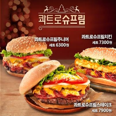 처음엔 '콰트로 슈프림'이나 '콰트로 스모키와퍼' 등이 나왔고, 이후 '콰트로 치즈 스테이크 버거' 라는 것도 나왔을 정도로 여러가지 시도를 했을 정도로 인기가 많은 버거 중 하나죠.