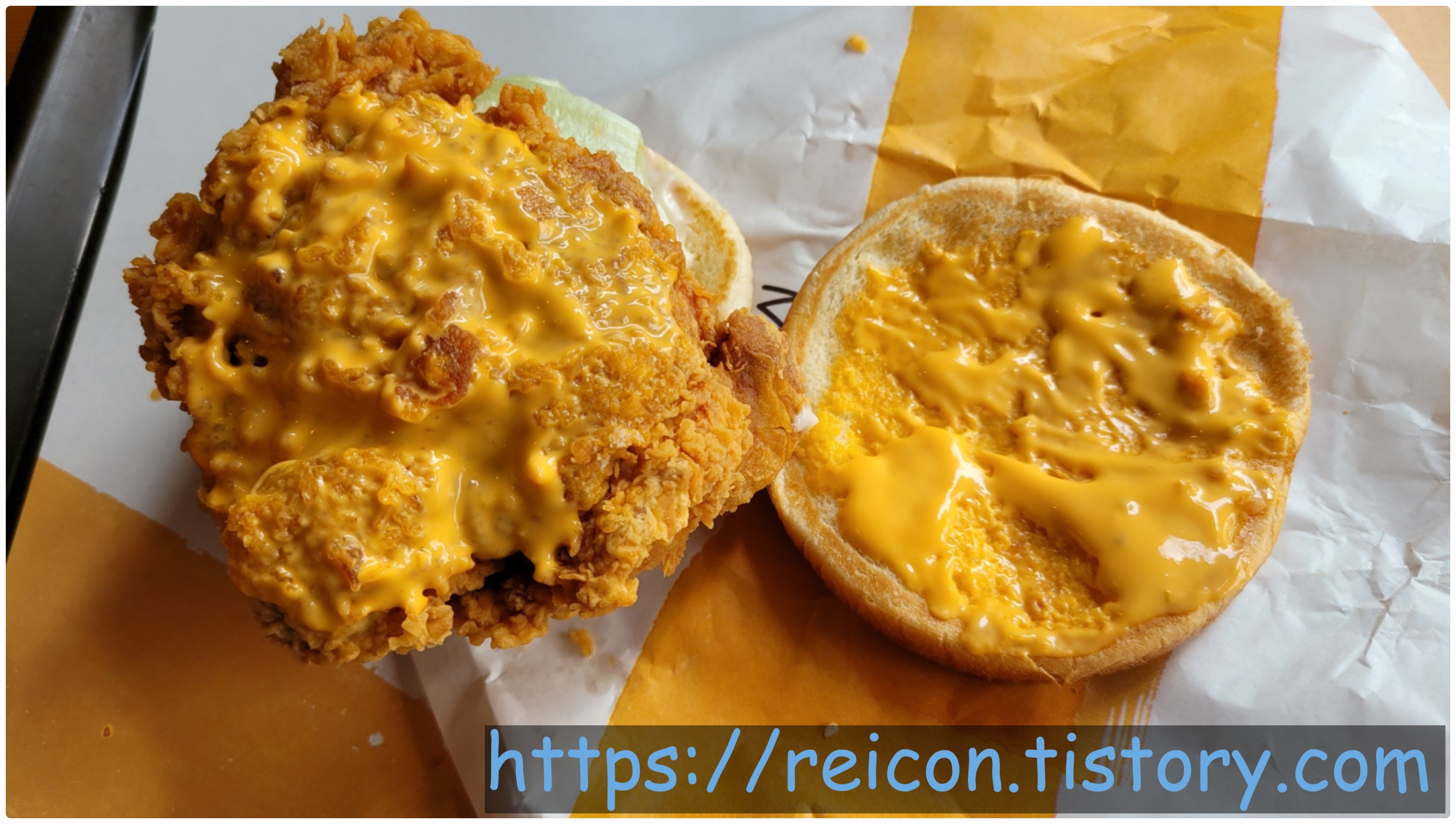 그래서 맛의 완성도가 높은 '싸이버거'(후기 링크)에 딥치즈 소스를 뿌려서 중심을 흐트러뜨린 느낌이 많이 들었는데, 마치 진짜 그런 의도로 만든 것인지는 몰라도 딥치즈 소스를 없는 부분에서는 싸이버거의 맛이 나기도 했네요.