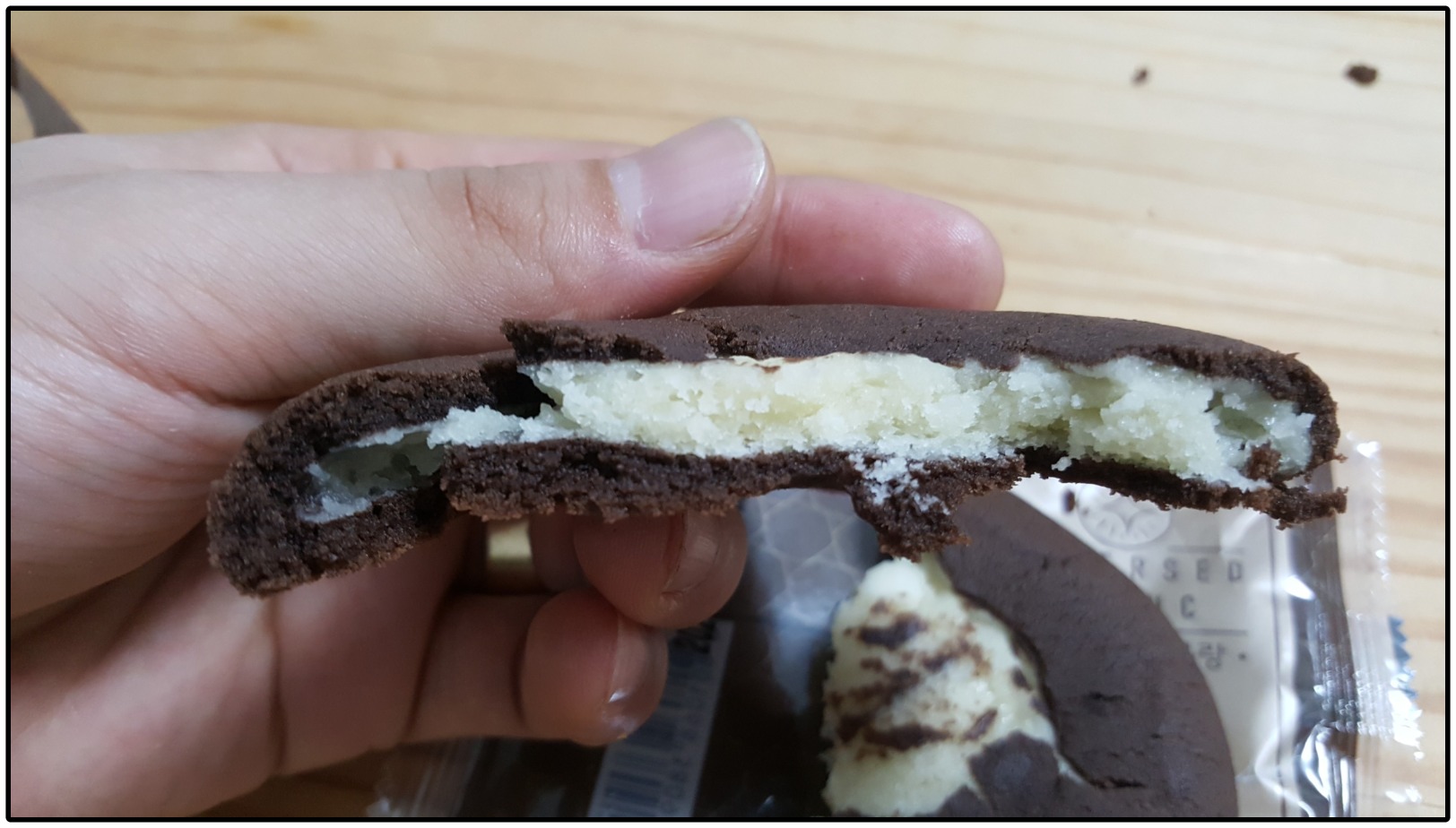 겉보기에는 브라우니 부분(?)이 밖으로 나오고 쿠키 부분이 안으로 들어간 줄 알았는데, 알고보니 코코아 향을 입은 쿠키 안에 화이트 초코가 들어있는 구성이더라구요.