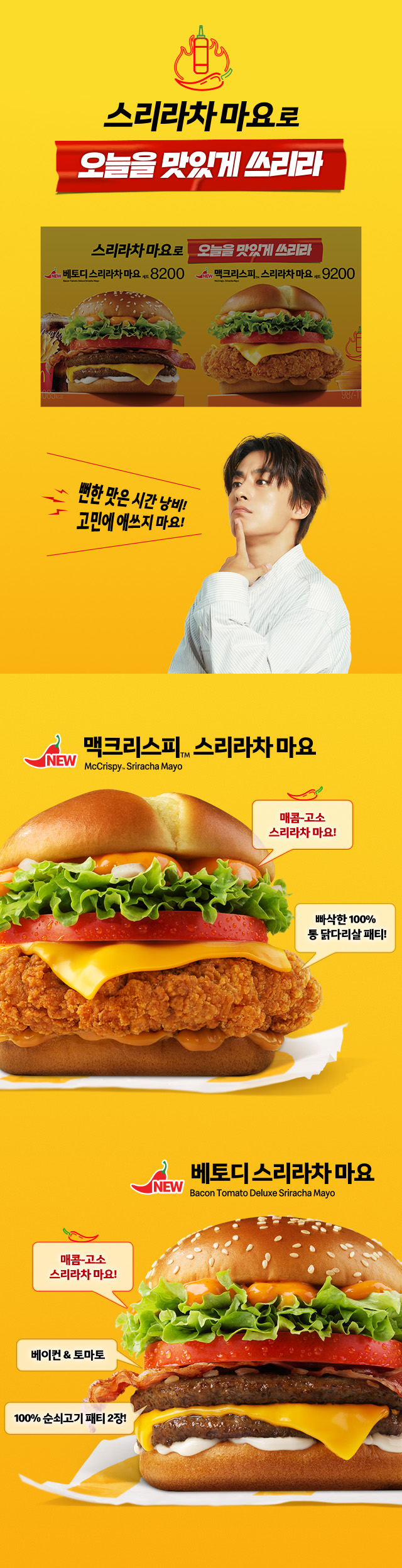 '맥크리스피 스리라차 마요, (베이컨 토마토 디럭스)베토디 스리라차 마요' 두 가지 버거가 출시가 되었으며, 기존 버거에 스리라차 마요를 추가하여 더욱 업그레이드가 된 것이 특징입니다.